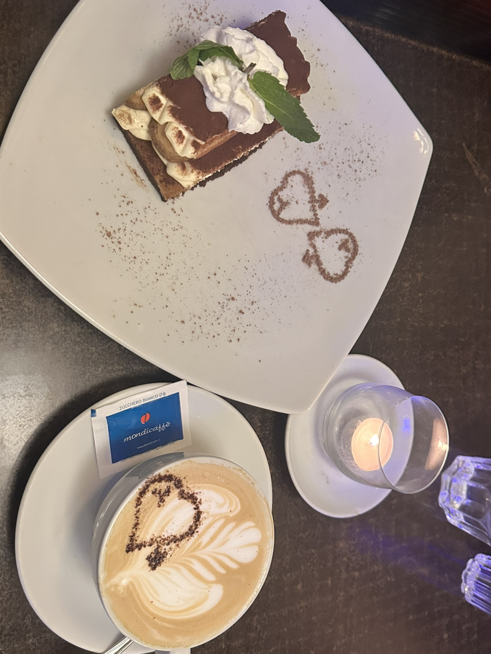그러고 향한 곳은 카페이다. 책을 읽어야 해서 카페를 찾아봤는데, 커피도 맛있고 티라미수도 맛있다는 집이 있어 가게 되었다. 카푸치노를 많이 마셔 카페 라떼와 티라미수를 주문했다. 티라미수와 커피 모두 하트 모양이 그려져 있어 귀여웠다. 커피는 3대 카페 중 하나인 안티코 카페 그레코와 비슷한 맛이었고, 티라미수도 신선했다. 케이크에 신선하다는 뜻이 어색하긴 한데 갓 만든 느낌이라서 좋았다. 그렇게 책도 읽고 테라스의 분위기도 즐기다가 약속 장소로 향했다.