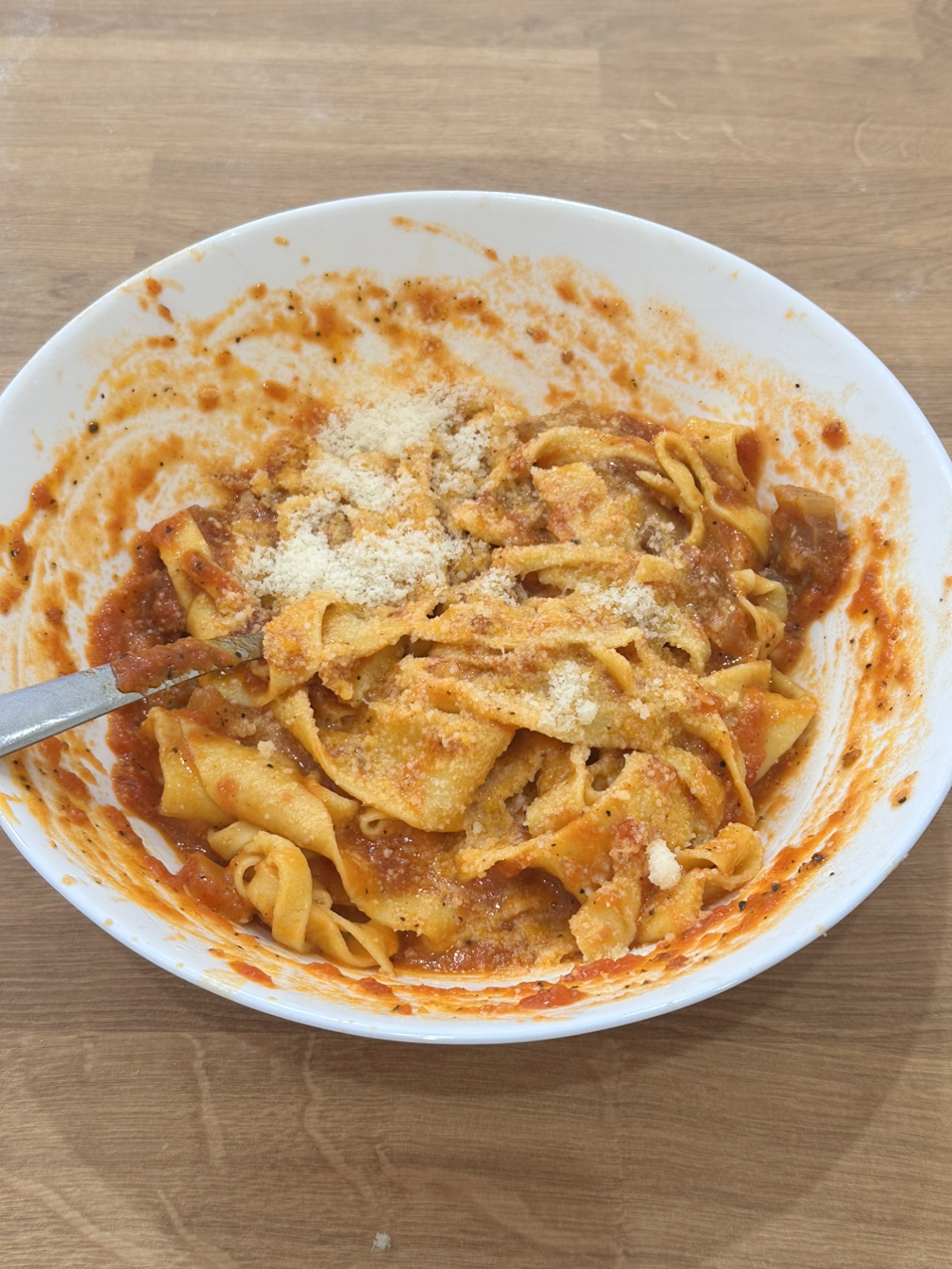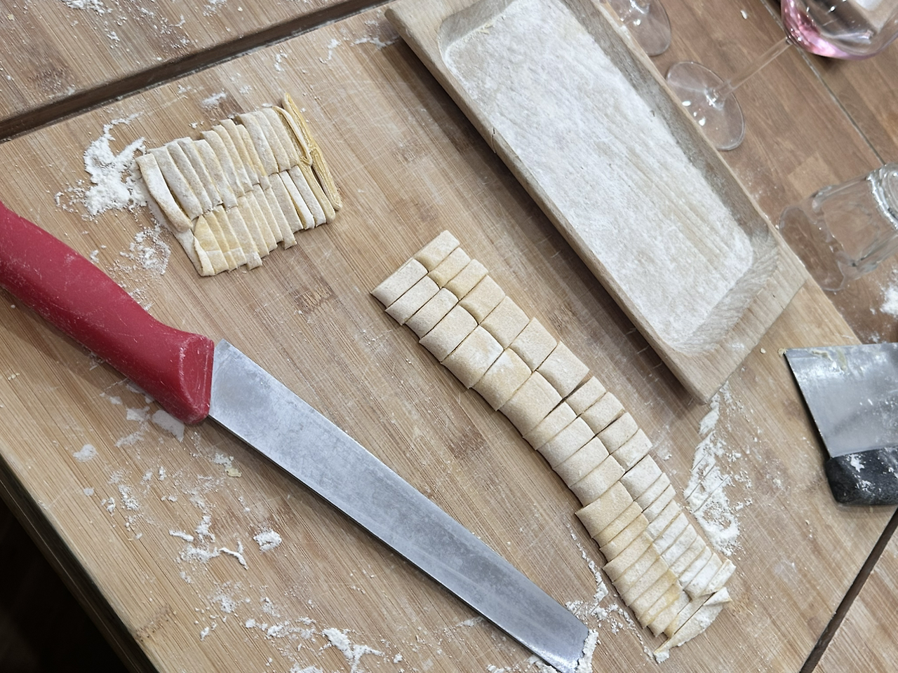 밀가루를 뿌린 후에 손가락 2개 넓이로 돌돌 만다. 아래에서 가운데까지 돌돌 접고, 위쪽에서 가운데로 돌돌 접으면 된다고 한다. 마지막으로는 돌돌 만 반죽을 원하는 크기로 썰면 된다. 여기서 써는 두께에 따라 파스타 면의 종류가 달라진다고 한다. 나는 다양하게 먹어보고 싶어서 3개의 굵기로 면을 썰어보았다.