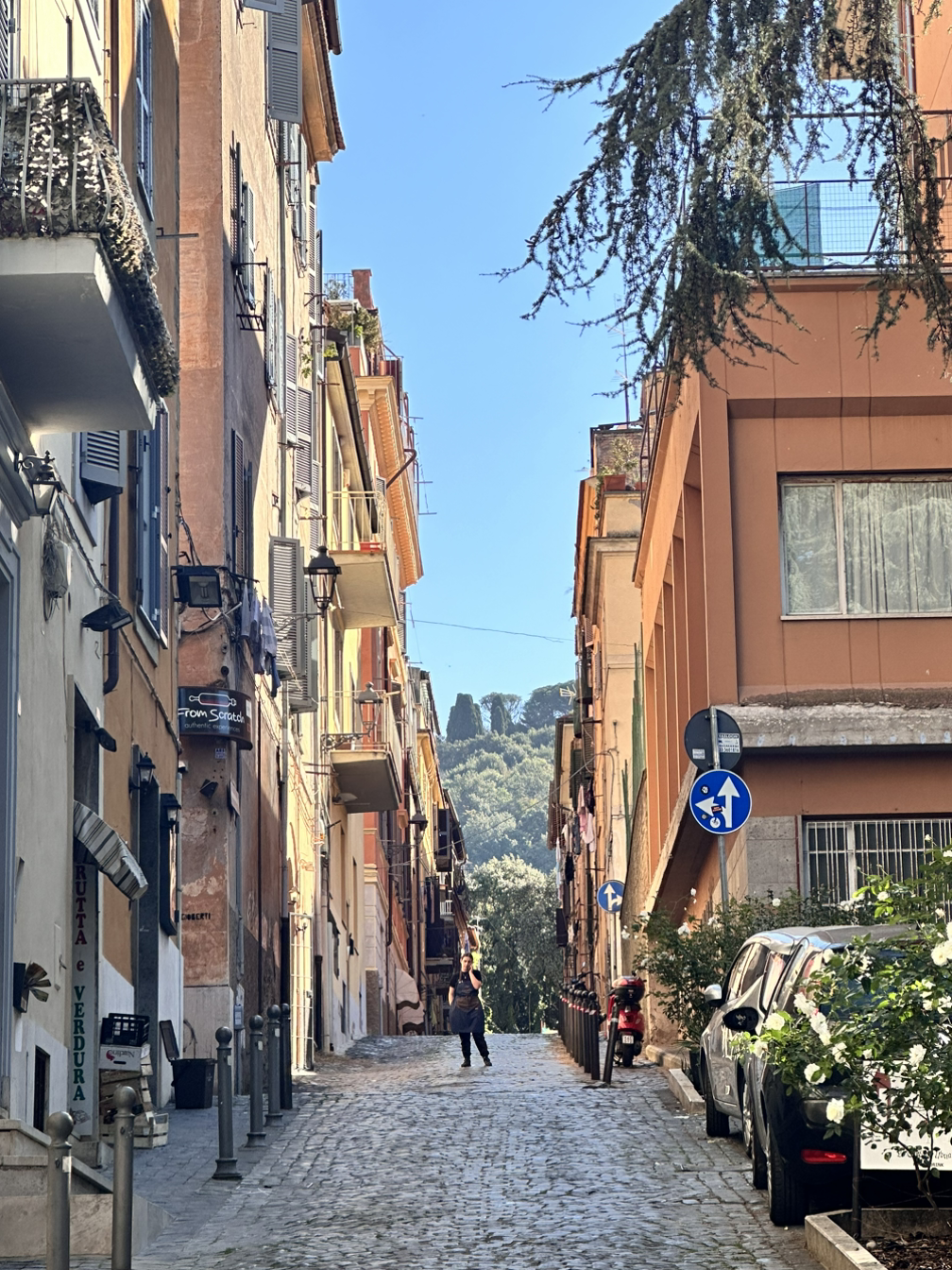 아침을 야무지게 먹고 기차를 타러 갔다. 기차표를 먼저 샀는데 플랫폼을 찾지 못해 급하게 여기저기 달려갔지만 무사히 탑승을 완료했다. 프라스카티까지 30분을 달려 도착했다. 로마의 남동쪽에 있는 아름답고 평화로운 소도시였다. 기차역에서 내리니 투어 가이드분께서 나와계셨다. 같이 투어를 신청한 분들과 만났는데, 내가 유일한 아시안이라 신기했다. 커플 분들도 많이 오셔서 혼자 온 사람은 나까지 세 명뿐이었다. 다행히 옆에 앉은 분과 친해져서 이런저런 얘기를 했다. 식당으로 가는 길의 중간중간 멈춰 이곳의 역사도 설명해 주셨다. 중간에 가장 유명한 뷰포인트가 있었는데, 로마까지 이어지는 풍경이 아름다웠다. 높은 건물 없이 아기자기한 집들과 나무, 그리고 푸른 하늘이 마치 그림을 보는 것처럼 귀여웠다. 그렇게 10분 정도 걸어 가게에 도착했다.