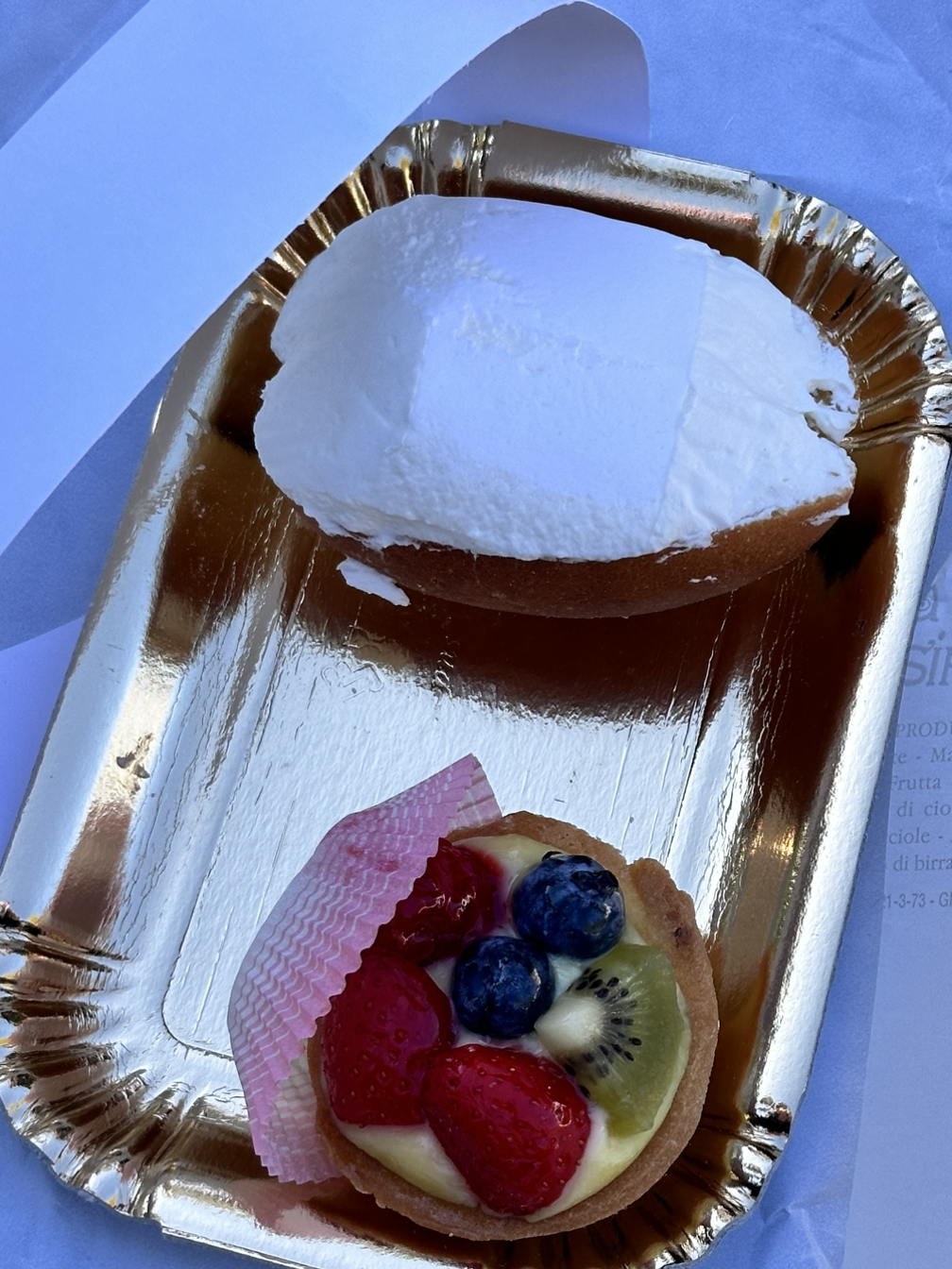로마에서 보내는 마지막 날이자, 현지인이 되어보는 날이다. 아침에 늦게 일어나 같은 민박집에서 친해진 언니랑 아침을 먹으러 갔다. 이탈리아 사람들이 아침으로 많이 먹는다는 마리토쪼를 먹으러 동네 베이커리에 갔는데 아침 10시에도 줄이 꽤 길었다. 15분 정도 기다려 미니 사이즈의 마리토쪼 하나와 과일타르트 하나를 주문했다. 먹고 가는 공간이 협소해 테이크아웃으로 주문했는데, 예쁘게 종이 포장도 해주셨다. 동네 공원으로 가 먹기 시작했다. 마리토쪼는 크림번과 비슷했는데, 빵이 퍼석했지만 크림과 잘 어울렸다. 크림은 부드럽고 진했는데 깊은 맛이 느껴지면서 살짝의 레몬 향이 상큼하게 만들어줘 물리지 않고 먹을 수 있었다. 과일 타르트 역시 상큼하게 맛있었다.