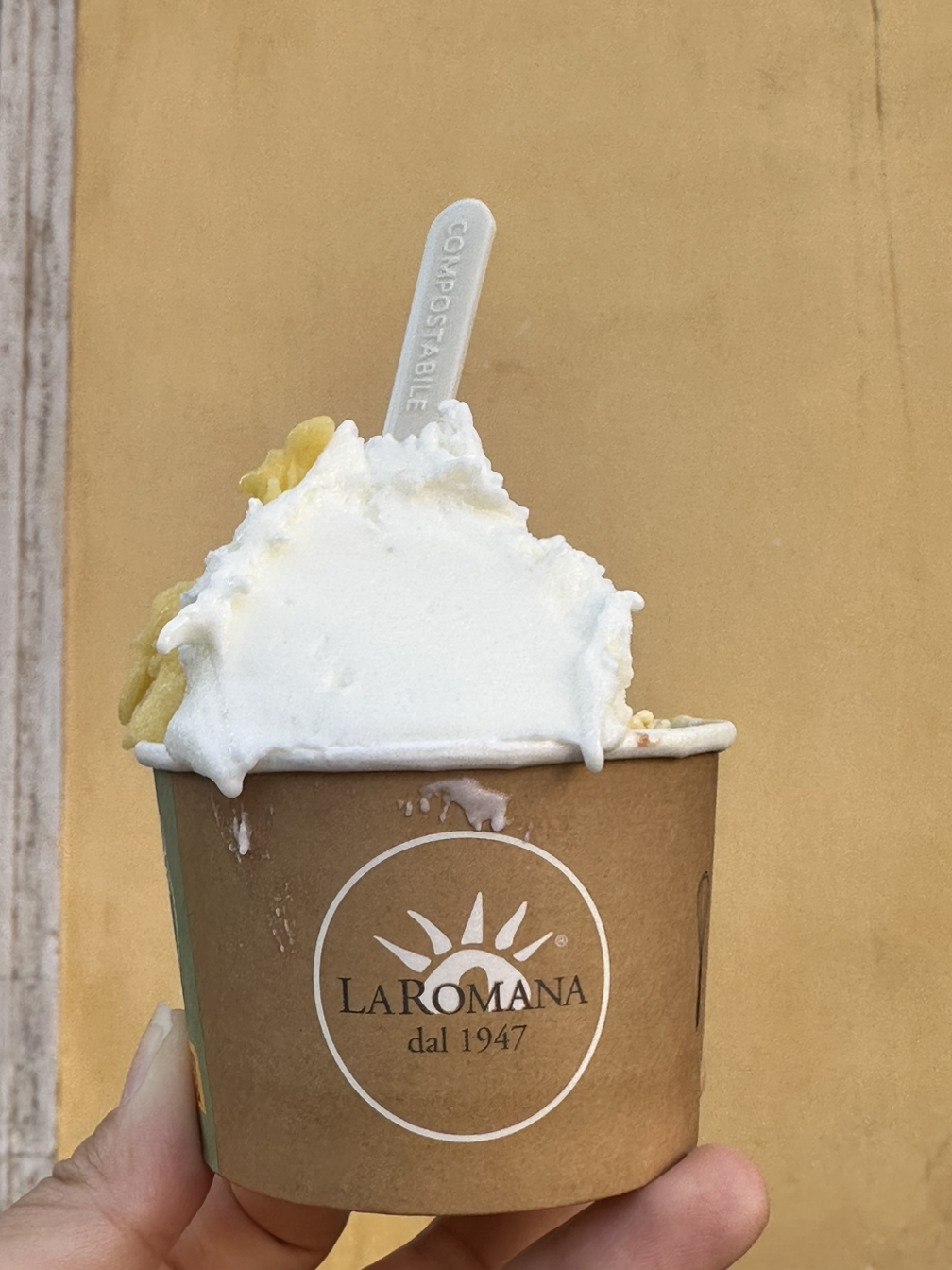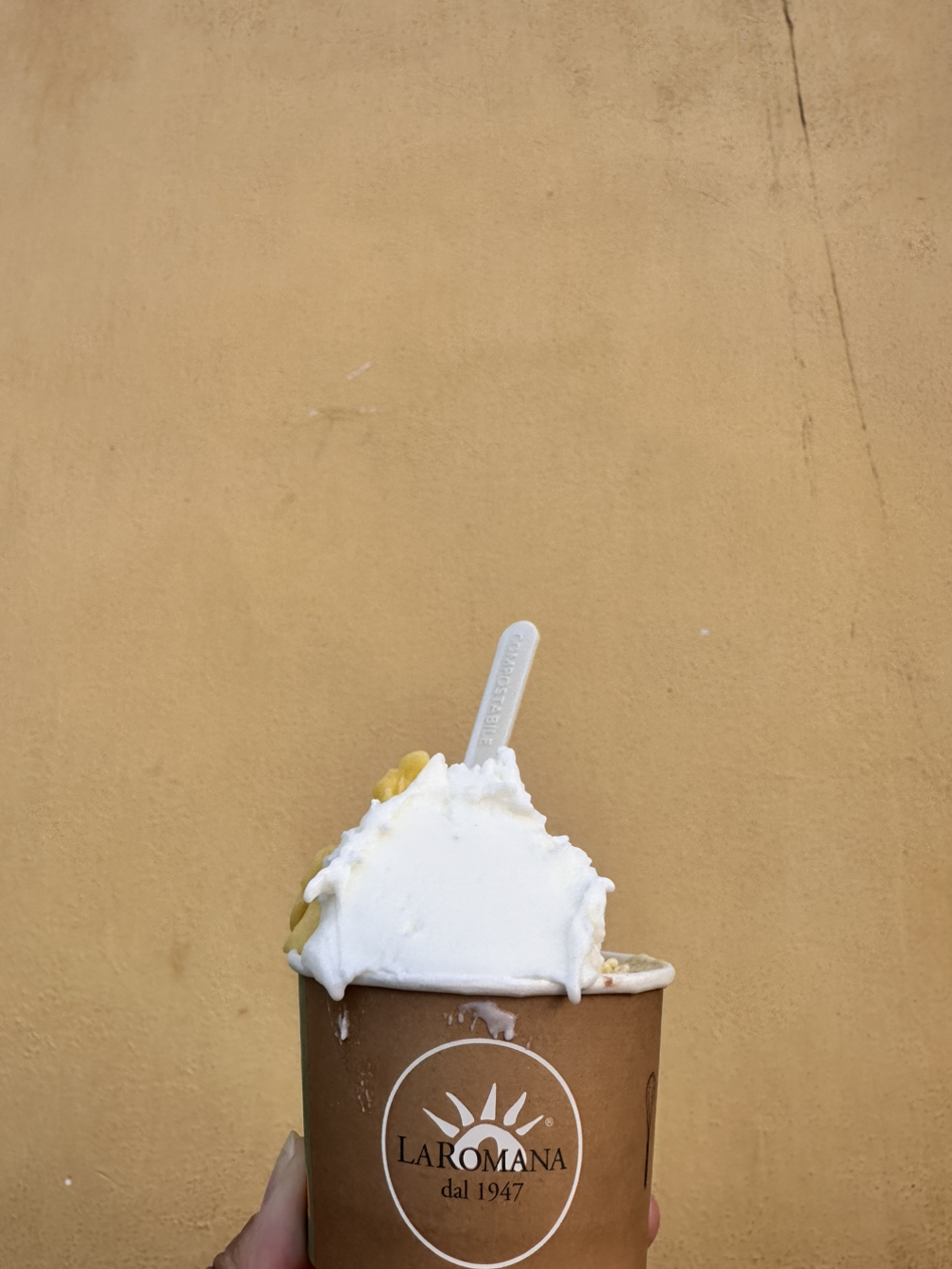 식사를 마무리하고는 가장 맛있었던 젤라또 집으로 가 젤라또를 하나 더 사 먹고 다른 카페로 향했다. 숙소 근처의 카페라서 50분 정도를 걸어가야 해서 3가지 맛으로 골랐다. 오늘 고른 맛은 피스타치오와 요거트, 그리고 귤이었다. 거리를 걸으며 요거트부터 한 입 먹어봤는데 충격의 맛이었다. 요거트의 풍미가 가득하고 산뜻함과 묵직함이 공존하는 인생에서 먹은 요거트 아이스크림 중에 가히 압도적이라고 할 수 있는 맛이었다. 만다린 아이스크림도 상큼하고 쫀득해서 맛있었고 피스타치오도 진하고 맛있었다.