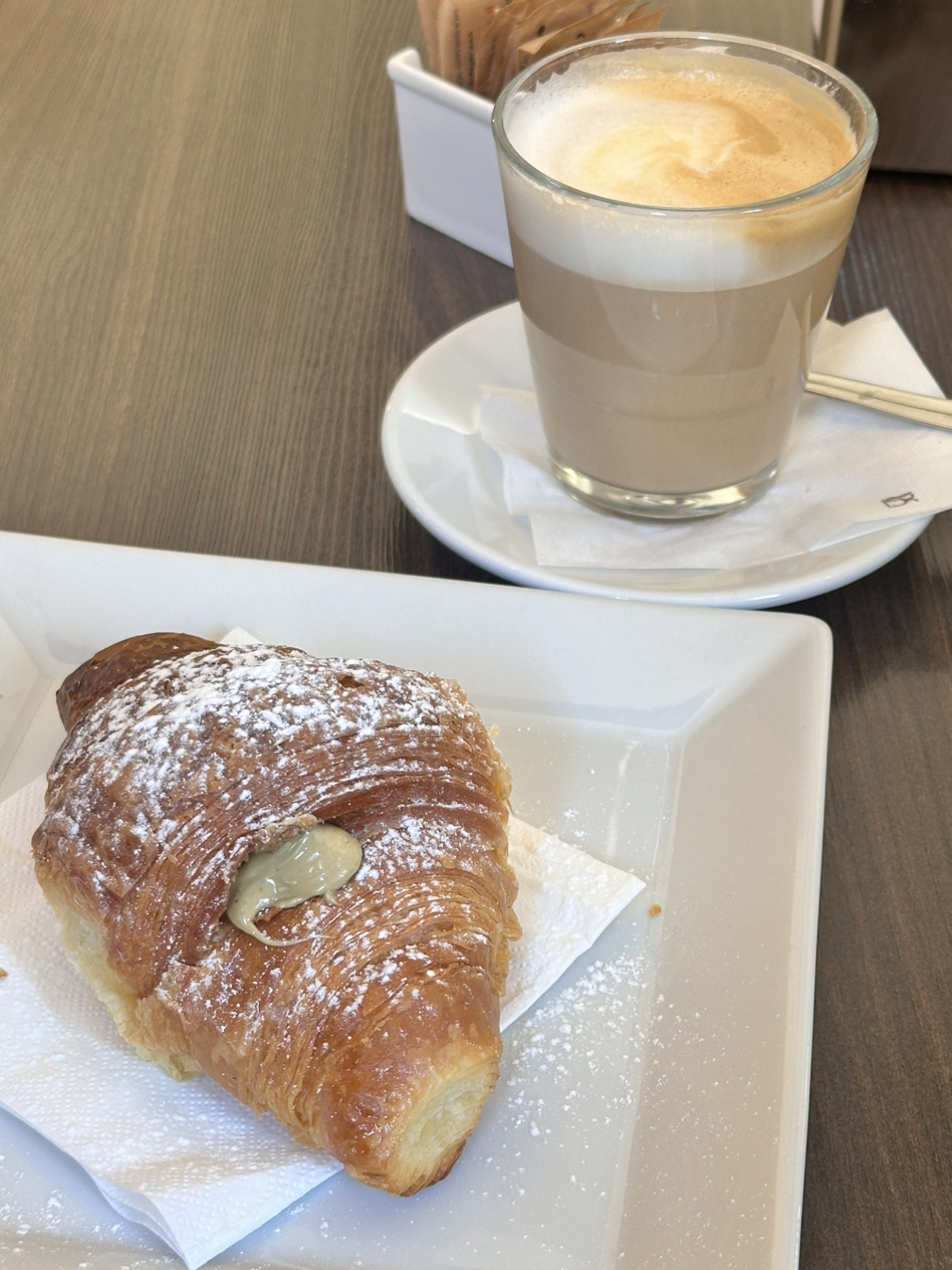 아침을 맛있게 먹고 언니와 헤어져 혼자 카페로 걸어갔다. 평점이 4.9점인 카페가 있길래 에스프레소를 마셔보고 싶어서 40분 정도 거리를 걸어갔다. 가는 길에 콜로세움과 포로 로마노를 지나는 길을 골라 50분 정도 걸렸지만, 가는 길에 가족들과 영상통화도 하며 걸어가니 금방 도착했다. 어젯밤부터 기대한 카페였는데 문이 닫혀있었다. 구글에는 이런 말 없었는데... 근처의 다른 카페를 급하게 찾아봤다. 그렇게 찾아 간 두 번째 카페도 자리가 없다고 해서 세 번째 카페에 갔다. 꽤 큰 동네 카페였는데, 기대 없이 들어가 카푸치노와 피스타치오 크로와상을 주문했다. 피스타치오 크로와상부터 나왔는데, 따끈따끈하게 나와서 감동을 받았다. 한 입 먹어보니 따뜻하면서도 바삭한 크로와상과 달달한 피스타치오크림이 맛있었다. 로마에 와서 먹은 크로와상 중에 가장 맛있었다. 중간에 흰 바지에 피스타치오 크림을 묻히긴 했지만 맛있어서 행복해지는 맛이었다.