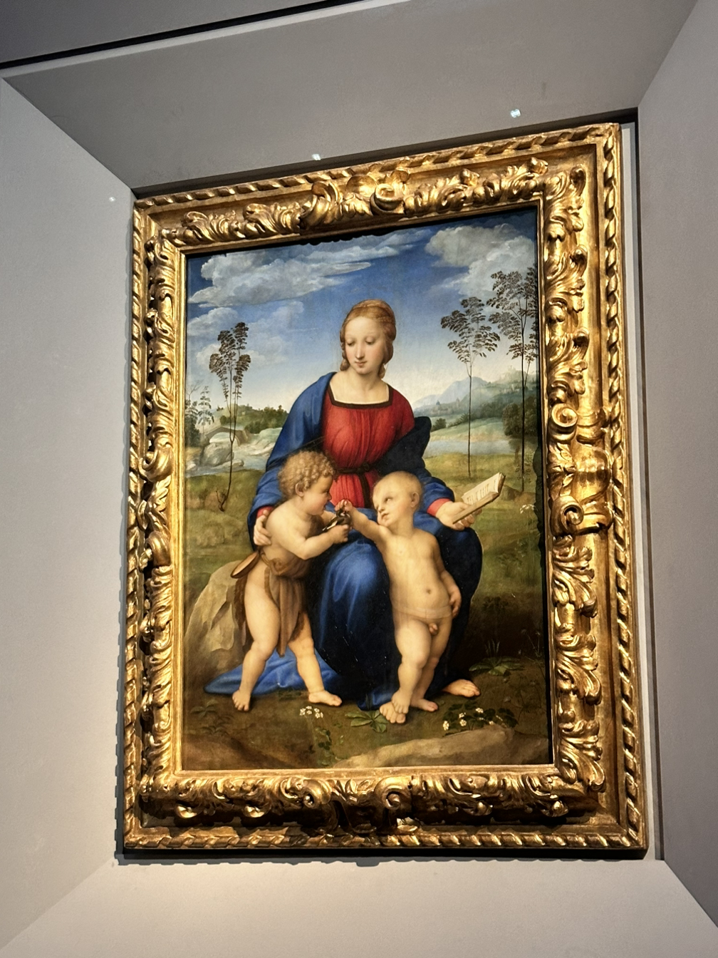 가장 좋아한 그림은 라파엘로의 <황금 방울새와 성모>이다. 세례자 요한과 예수가 놀고 있고, 성모는 바위에 앉아 둘을 돌보고 있다. 방울새를 매개로 한 의미가 있는 것도 신기했다. 이 그림의 배경이 움브리아 지역인데, 움브리아 지역을 배경을 배경으로 한 그림들이 모두 평화로운 분위기와 아름다운 자연을 가지고 있어서 마음에 들었다.