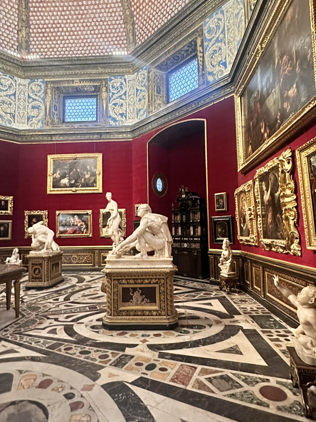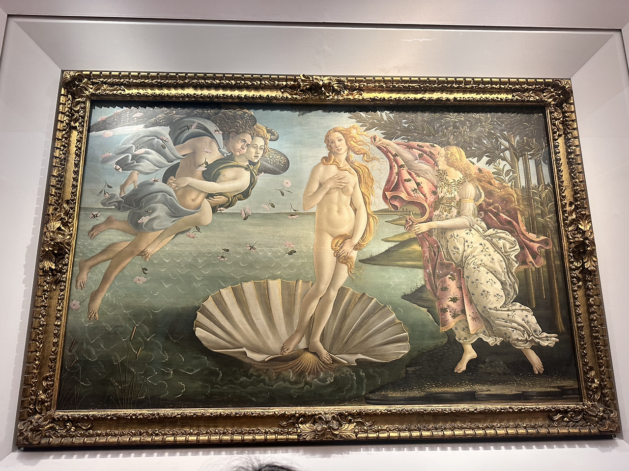 짐을 민박집에 두고 길을 나서 우피치 미술관으로 향했다. 2시 30분에서 2시 45분 사이에 입장하는 티켓을 구매해서 2시 40분에 갔는데, 사람이 정말 많아 보안 검색대 줄을 꽤 기다려야 했다. 나는 미술관을 혼자 여유롭게 보고 싶은 로망이 있어 마이리얼트립에서 오디오 가이드만 구매해서 다운로드하여갔다. 그렇게 입장해 2층부터 보기 시작했다. 우피치 미술관은 메디치 가문의 소장품이라 그런지 종교화가 많이 보였다. 수태고지, 마에스타 등 하나의 종교적인 주제로 그린 여러 가지 그림들이 있어 신기했다. 그러다가 비너스의 탄생을 기점으로 종교가 아닌 신화 속 그림들도 등장하기 시작했다. 미술책이나 TV 프로그램에서만 보던 비너스의 탄생을 직접 보니 신기했고, 규모가 생각보다 커서 압도 당하는 기분이 들었다.