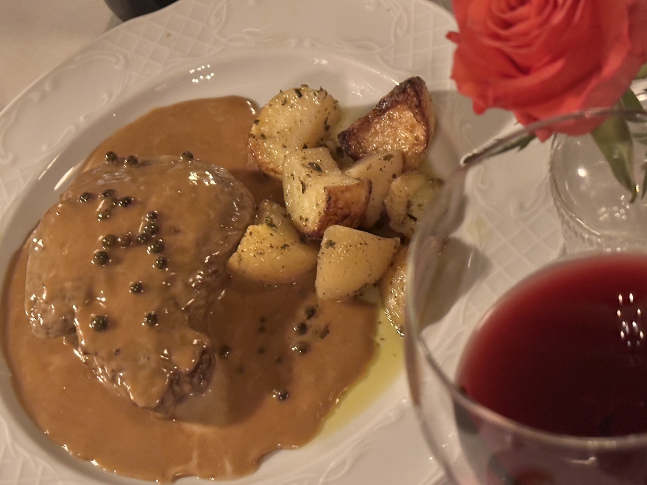 미술관에서 나와 향한 곳은 식당이다. 점심도 못 먹어 배가 잔뜩 고픈 상태로 미리 예약해 둔 식당으로 왔다. 배가 고팠던 나머지 오는 길에 메뉴도 다 골라놔서 앉자마자 바로 주문했다. 후추소스 안심 스테이크와 감베리 파스타를 주문했다. 식전빵을 먼저 먹는데, 올리브오일과 발사믹 식초가 특이했다. 올리브오일은 올리브의 향보다 올리브 나무 잎의 향이 진하게 났다. 상상하던 맛보다 푸릇푸릇한 맛이었고, 색도 초록색에 가까웠다. 발사믹 식초는 굉장히 액체 같았다. 보통 조금의 점성은 있는데, 포도 주스 같았다. 맛도 상큼 그 자체라서 감탄을 연발하며 먹었다. 같이 주문한 와인도 마셔봤는데, 묵직함이 남달랐다. 고기와 잘 어울릴 것 같아 기대가 되었다.