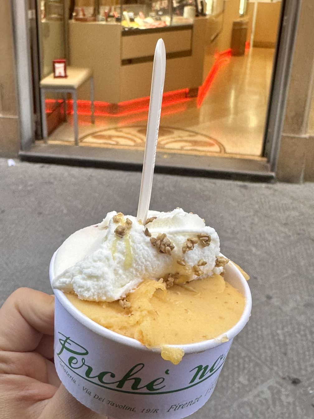 오늘은 먹고 싶은 디저트가 두 종류라서 딱히 점심을 안 먹고 간식을 주워 먹기로 해서 가고 싶었던 젤라또 집으로 향했다. 깨맛이 유명한 곳이라서 깨와 감으로 골랐다. 나와서 깨부터 한 입 먹어보니 처음 먹어보는 젤라또의 맛이었다. 젤라또만 먹으면 부드러운 우유에 꿀의 맛이 느껴지고, 베이스로 은은한 깨 향이 났다. 감은 시원 달달한 홍시의 맛이라서 맛있게 먹었다.