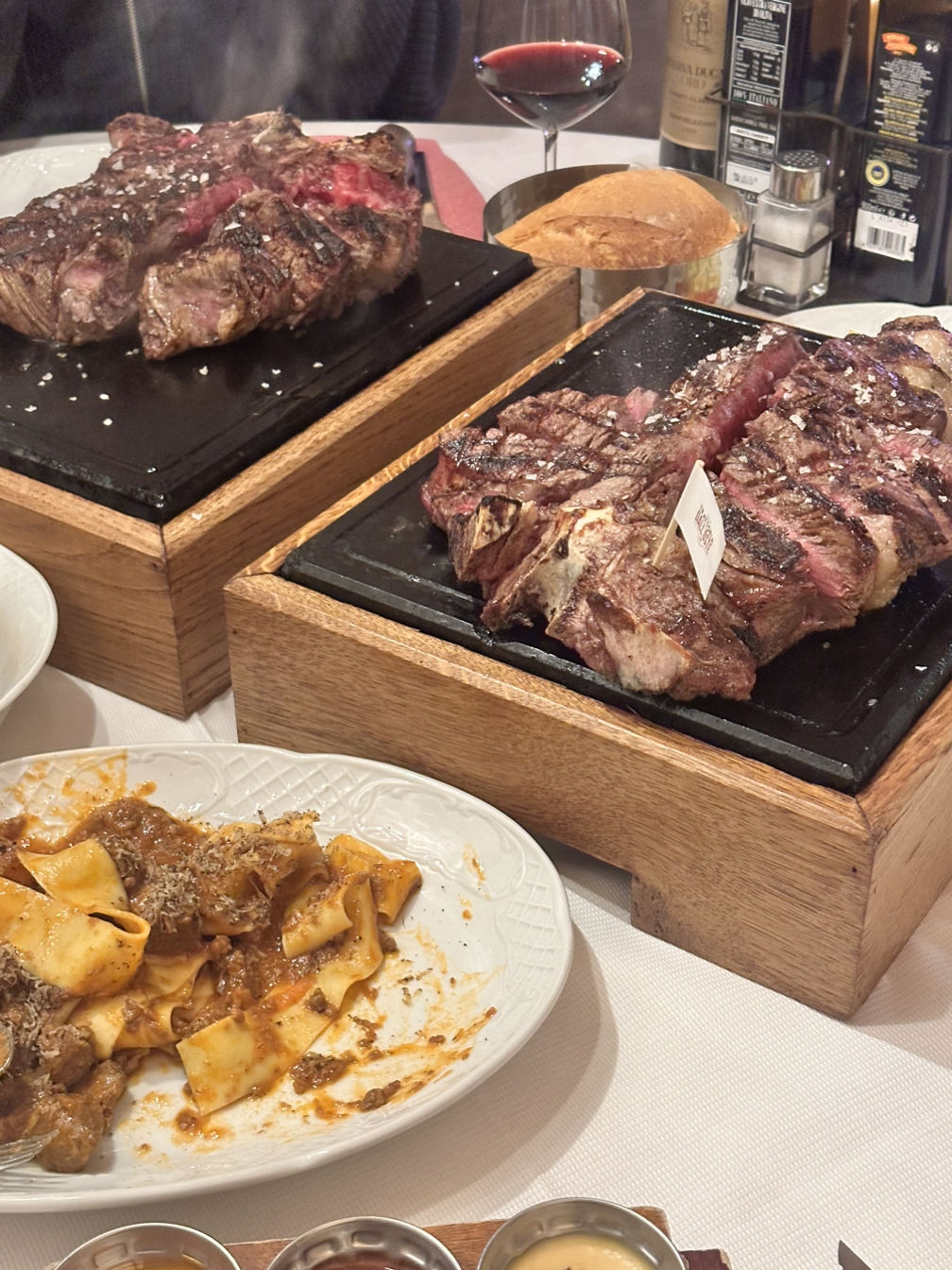 오늘의 마지막 일정이자 가장 기대한 일정, 바로 티본스테이크이다. 가장 유명한 달오스떼에 예약을 하고 동행을 구해 5명이서 갔다. 처음 보는 사람이 3명이라 어색했지만, 조금씩 얘기하다 보니 어색함이 조금씩 줄었다. 5명이라서 티본스테이크 2 덩어리, 파스타, 사이드 채소를 주문했다. 파스타부터 먹어봤는데 우리나라의 미트볼과 비슷한 맛이었다. 위에 트러플을 추가해 향이 깊었지만 소스 자체는 익숙한 맛이었다. 그다음으로 나온 티본 스테이크는 감동의 맛이었다. 전에 티본 스테이크에 대한 안 좋은 기억이 있어 기대를 안 했는데, 정말 맛있었다. 추천해 주신 미디움으로 주문해 안에는 빨간색이었지만 질기지 않고 맛있었다. 고기의 맛도 깊고 향도 진하고, 간도 적당해서 그냥 먹어도 소스에 찍어 먹어도 맛있었다. 티본이 유명한 이유가 이해가 갔다. 호불호가 갈리던데 기대를 안 하고 먹어서 그런지 감동의 맛이었다. 비싼 와인도 한 병 주문했는데, 드라이하고 뒷맛이 깔끔해서 고기와 잘 어울렸다.