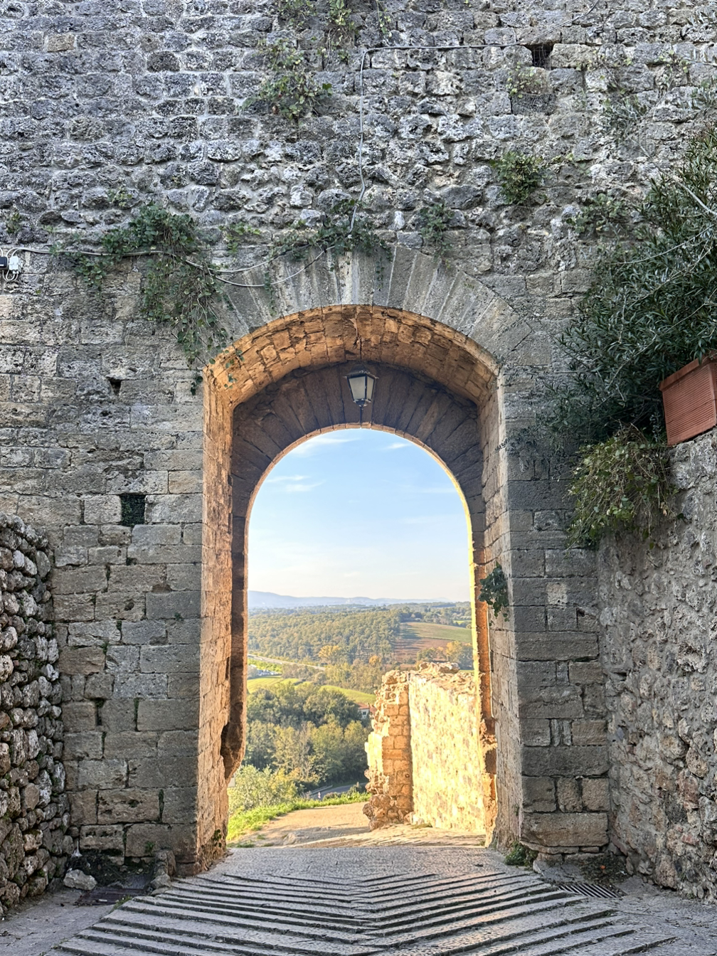 다음으로 간 코스는 몬테리지아노이다. 언덕 위에 있는 작은 마을이라 자유시간을 50분 정도 주셨는데 충분했다. 한 바퀴를 둘러보는데 20분이면 충분한 작은 마을이고, 언덕 위에 있어서 주변이 나무로 가득해서인지 동화 속에 나오는 비밀 마을 같았다. 언니들이랑 가위바위보로 생 올리브 먹기도 했는데, 내가 걸려서 먹어봤다. 그린 올리브와 블랙 올리브가 있어 물로 가볍게 씻어 먹어봤는데 올리브의 향긋한 향은 나지만 굉장히 떫었다. 그린은 딱딱하고 블랙은 조금 더 말랑한데 블랙이 더 떫었다. 너무 떫어서 물을 마셔도 없어지지 떫은맛이 않았지만 덕분에 입 안이 깔끔해진 느낌이었다. 올리브라는 이탈리아의 특산품을 먹어볼 수 있고, 하나의 특별한 추억도 생길 수 있어서 좋았다. 아기자기한 산속 마을 같았던 몬테리지아노를 짧게나마 즐기고 버스로 향했다.