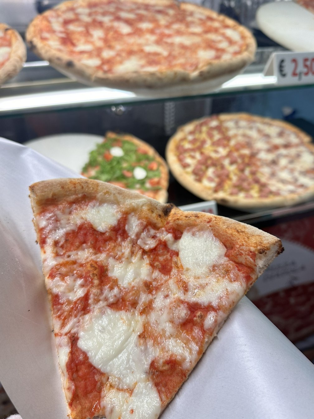가는 길에 찾아본 조각 피자집이 있어 간식으로 먹으려고 갔다. 이탈리아에 먹으러 와서 그런지 먹어도 먹어도 마지막 날이라는 생각에 아쉬움이 계속 들었던 것 같다. 조각 피자를 먹은 적이 없어서 마르게리따 한 조각을 사봤다. 2유로였는데, 커다란 피자 조각을 데워주셨다. 한 입 먹어보니 비주얼대로 간단하지만 그래서 맛있는 맛이었다. 얇고 바삭한 도우와 새콤한 토마토소스, 짭짤하고 고소한 치즈까지 정석적인 맛이라 걸어가면서 맛있게 먹었다. 다음으로 또 먹으러 갔는데, Grom이라는 젤라또 집이 있는데 로마에서도 본 체인점이라 한 번 가보고 싶어 방문했다. 바티칸 가이드님께서 추천해 주셔서 피스타치오와 망고 맛을 먹었는데, 유명한 프랜차이즈 젤라또 집에서 먹을 것 같은 깔끔하고 달달한 젤라또 맛이었다. 나는 프랜차이즈보다는 작은 가게의 젤라또를 좋아해 감동적인 맛은 아니었다. 그렇게 젤라또를 먹으며 주변 구경도 하다가 미팅 포인트로 향했다.