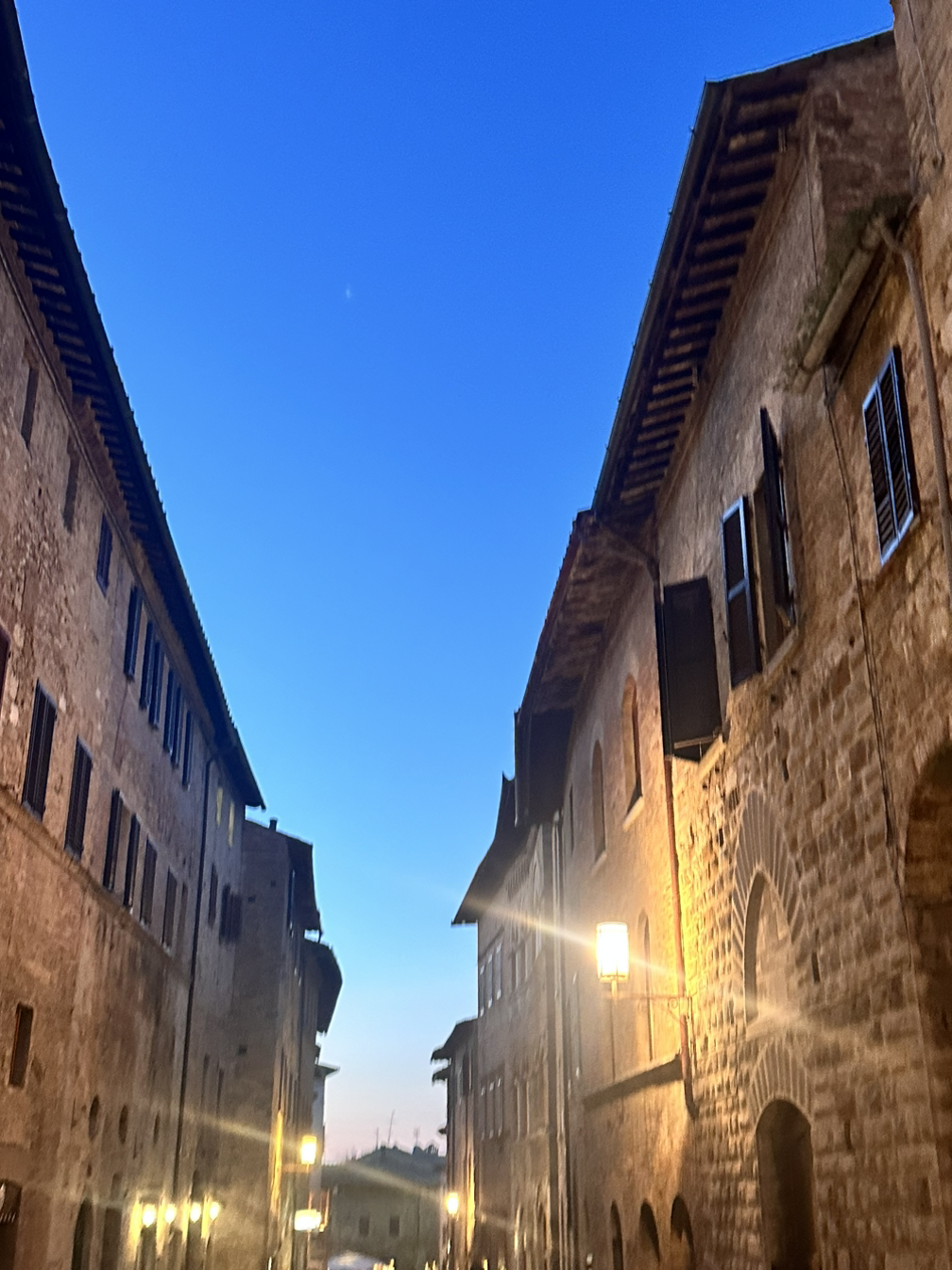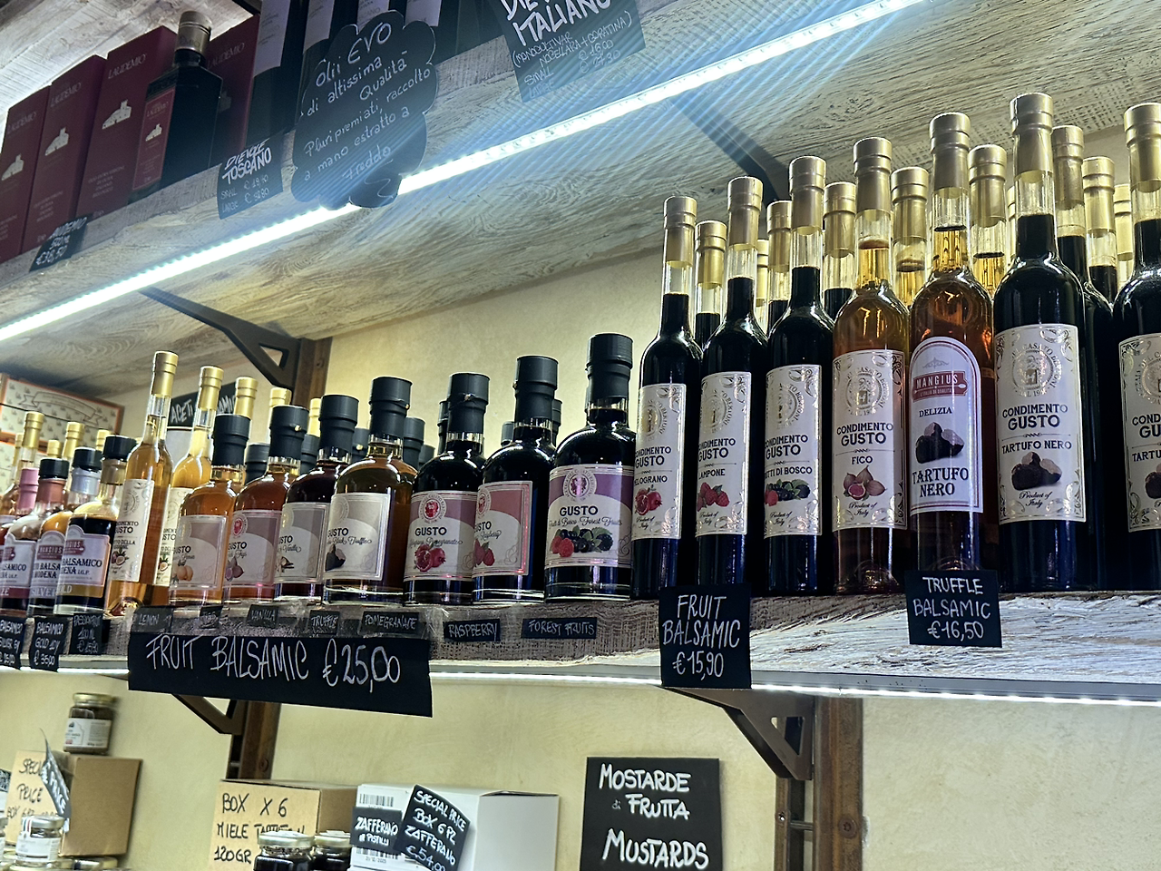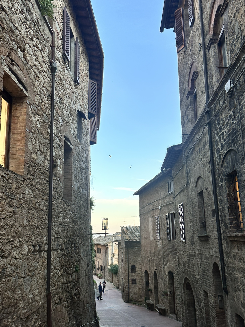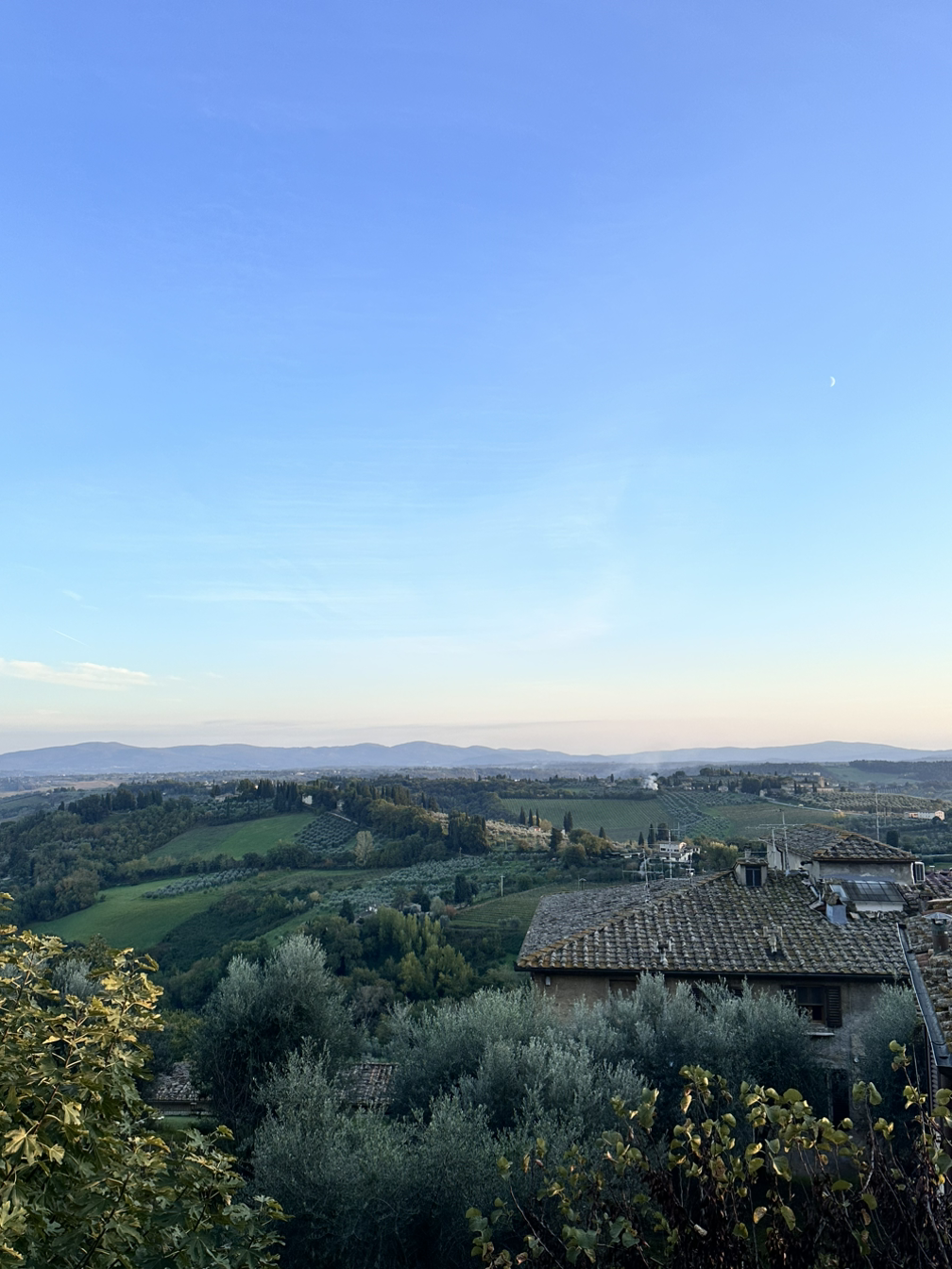 그렇게 버스에서 또 달려 마지막 도시인 산 지미냐노에 도착했다. 사실 오늘의 네 번째 도시라 그런지 도착했을 때는 약간 지쳐 있었다. 아침부터 일어나고 술도 마셔서인지 피곤하기도 했고, 네 번째 도시다 보니 감흥도 조금 떨어진 것 같다. 그러나 산 지미냐노의 풍경과 분위기는 우리의 피곤함도 날려주었다. 몬테리지아노보다 큰 도시고 관광 산업이 조금 더 발달되어 있지만 조용한 분위기는 비슷했다. 들어가자마자 발사믹을 전문적으로 판매하는 식당에 들어갔는데, 주인 분께서 온갖 종류의 발사믹을 주셨다. 가장 맛있었던 오리지널 발사믹부터 베리, 화이트 발사믹, 패션후르츠 발사믹까지 다 맛있었다. 가장 특이했던 건 트러플 꿀이었는데, 예상치 못한 조합이었지만 오묘하고 신비한 맛이었다. 세상 어떤 종류의 치즈와도 잘 어울릴 것만 같은 맛이었다. 꿀을 좋아하는 지인에게 선물할까도 싶었지만 하나 둘 사다 보면 끝이 없을 것 같아 포기하고 돌아다녔다. 셋 다 걸어 다니는 것을 좋아해서 골목골목 돌아다니기 시작했다. 어떤 전망대에도 갔는데, 우연히 프로포즈하는 커플을 봐서 찡했다. 남자분도 여자분도 행복 가득한 표정과 웃음이라서 옆에 있던 우리도 행복해지는 기분이었다.