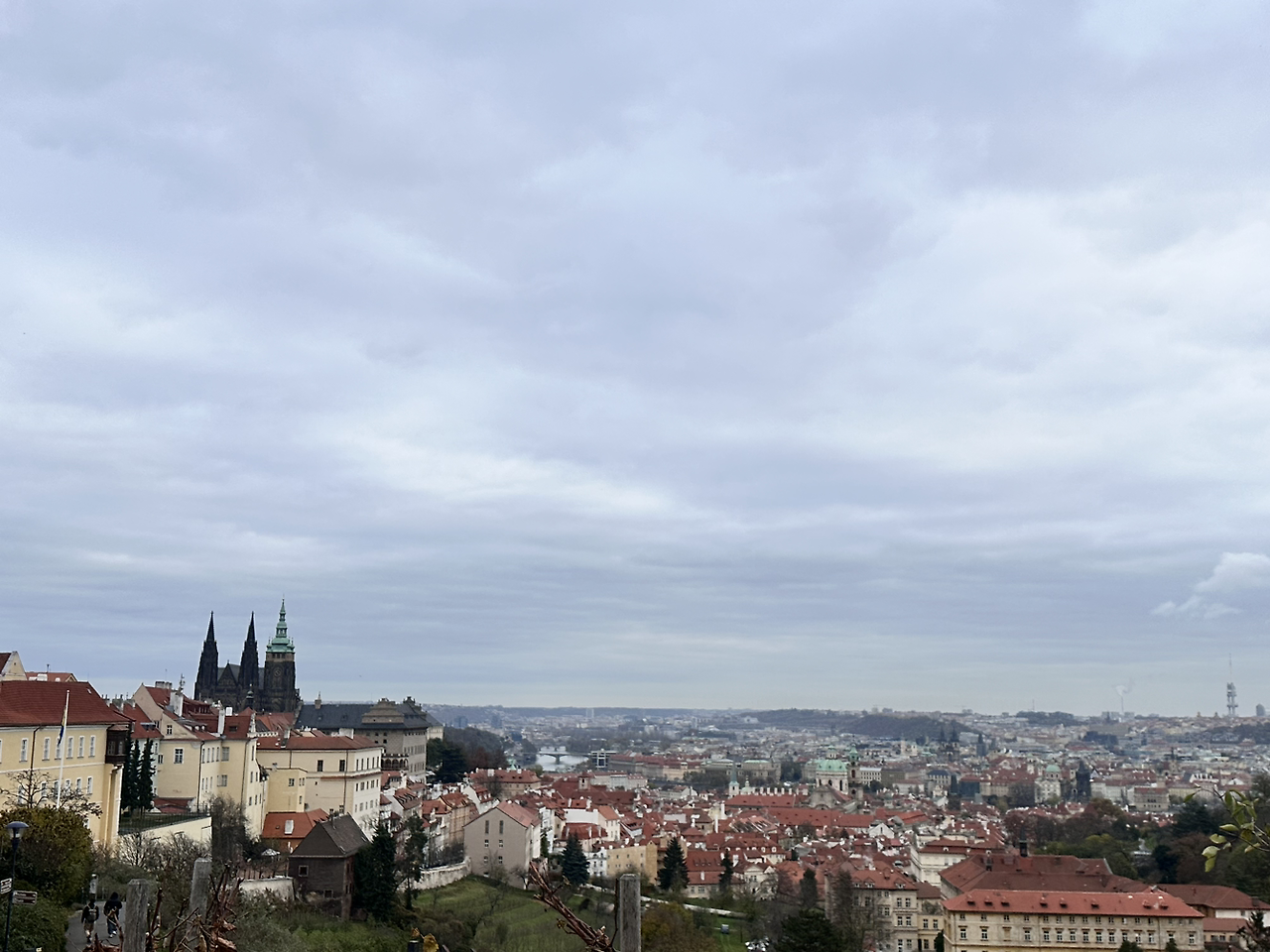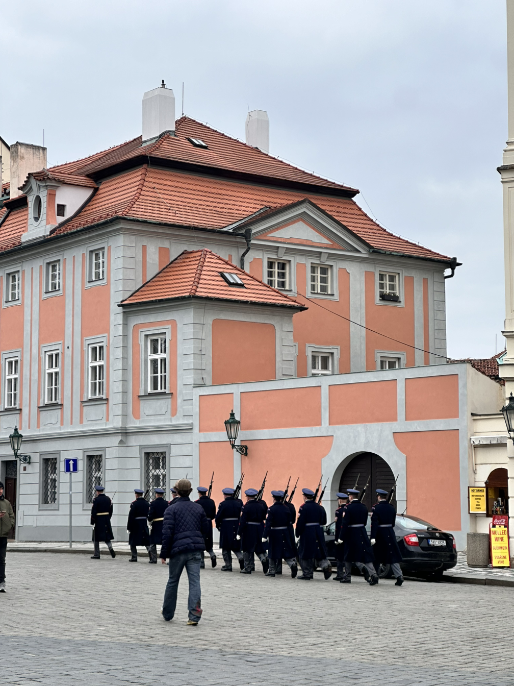 만족스러운 간식 타임을 가지고 우리는 프라하 성으로 향했다. 날이 쌀쌀해서 따뜻한 라떼 한 잔도 들고 걸어갔다. 프라하 성에 거의 도착하니까 웅장한 악기 소리가 들렸다. 가까이 다가가니 근위병 교대식을 하고 있었다. 신기했지만 웅장함이나 놀라움은 없었다. 프라하 성 외부에 있는 성벽 같은 곳에서 본 프라하 전경이 아름다워서 내부는 얼마나 더 아름다울지 기대가 되었다. 사진 몇 장을 찍고 내부로 입장했다. 내부에서는 티켓을 사야 했는데, 분명 23-24 가이드북에는 250 코루나로 적혀있는 티켓이 갑자기 450 코루나로 올라서 당황했지만 프라하성 내부가 예쁘다고 해서 구매를 했다.