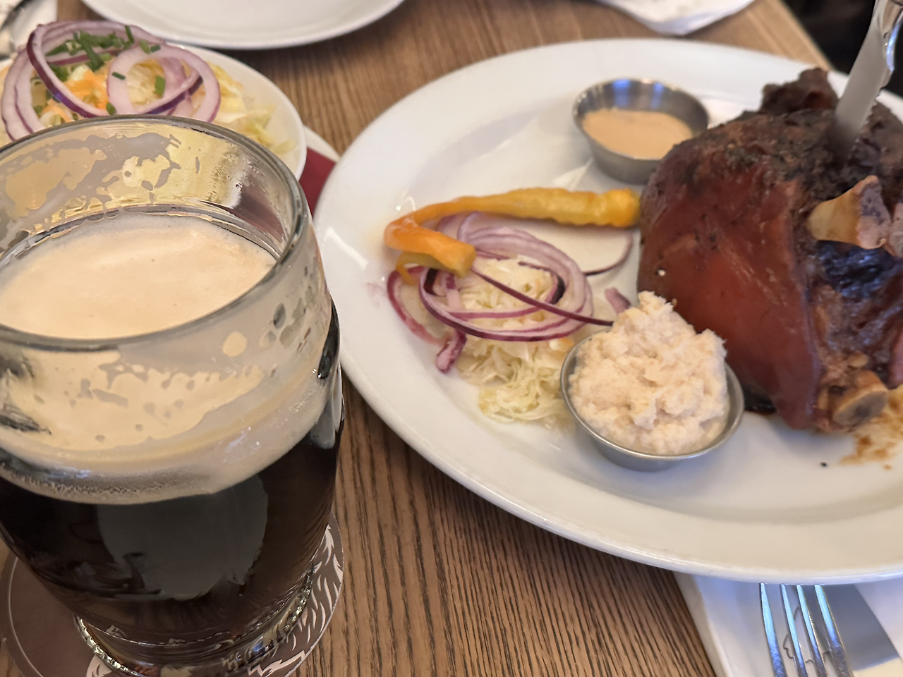 시내로 내려가니 2시가 훌쩍 넘어서 밥을 먹으러 갔다. 가기 전에 발트슈타인 궁전의 정원을 보고 싶었는데 겨울이라서 문을 닫았다. 푸른 돔을 가진 성 니콜라스 성당도 밖에서 보고, 점심을 먹을 식당인 포크스로 향했다. 줄이 길었지만 리뷰에 금방 줄어든다는 말이 있어 차분하게 기다렸다. 하지만 30분을 기다려도 줄어들 것 같지 않아 포기하고 코젤로브나라는 곳으로 향했다. 코젤에서 직접 맥주를 받아 판매하는 곳이라 흑맥주가 유명했다. 우리는 꼴레뇨와 양배추 샐러드 그리고 흑맥주를 주문했다. 포크스의 꼴레뇨는 겉이 바삭하고 여기는 쫀득하다던데 리뷰대로 정말 쫀득했다. 사실 쫀득함을 넘어서 질긴 편이었다. 칼로 잘리지 않고, 먹어도 치아에 다 붙는 정도의 쫀득함이었다. 그래도 안에 살이 부드러워서 맛있게 먹었다. 여기서는 양배추 샐러드가 킥이었다. 달달 상큼한 소스가 맛있어서 꼴레뇨랑 잘 어울렸다. 흑맥주도 시원하고 향이 독특하면서도 부드러웠다. 흑맥주를 처음 마셔보는데, 커피 향 같은 깊은 향이 나면서도 맥주의 맛과 향도 있고 동시에 특이하게 맛있어서 계속 마셨다. 배부르게 먹고 구시가지 관광을 시작했다.
