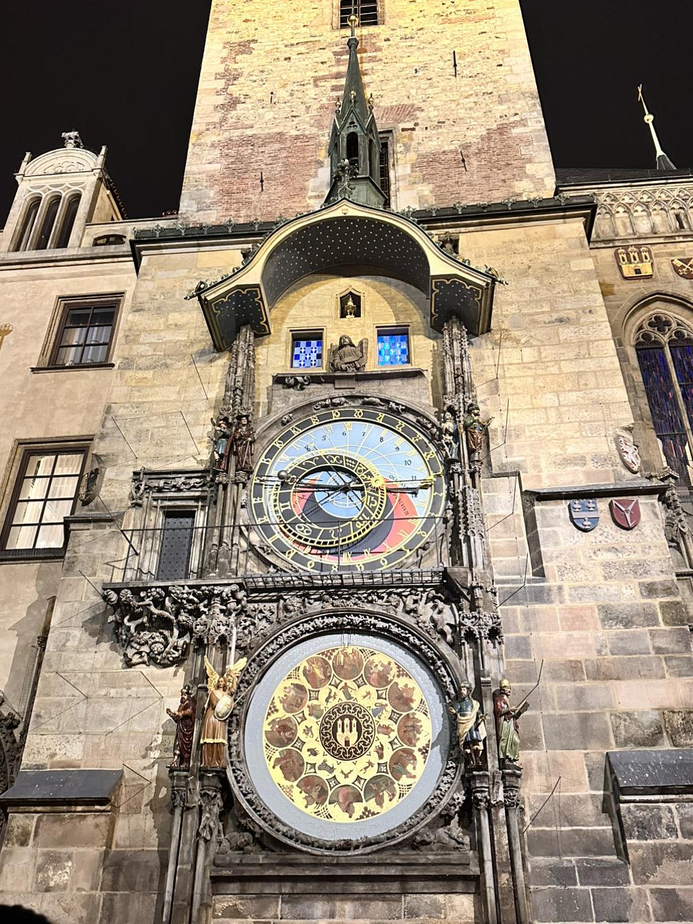 숙소로 오는 길에도 아쉬워서 야경을 마지막으로 눈에 담고 숙소로 걷기 시작했다. 걸어오는데 사람들이 천문시계 앞에 몰려있어 시계를 봤더니 정각 7분 전이었다. 천문시계에서 정각마다 하는 공연이 유명하다고 해서 기다렸다가 보고 가기로 했다. 우연히도 투어 가이드님이 우리 앞으로 와서 설명을 하셔서 설명을 조금 듣게 되었는데, 이 시계 하나로 오늘 뜨는 달과 해가 지는 시간, 현재의 시간까지도 알 수 있다고 한다. 공연을 30초 정도 진행되었는데, 죽음을 의미하는 해골이 모래시계를 뒤집으면 양 옆에 있는 돈주머니를 든 인형, 악기를 든 인형, 그리고 다른 한 인형(까먹었다..)이 고개를 흔든다고 한다. 동시에 위에 있는 창문으로 예수님의 열두 제자가 나오고, 마지막 제자까지 나온 후에는 맨 위에 있는 닭이 울면서 공연이 마무리된다고 한다. 짧은 공연이었지만 곳곳에 숨은 포인트들이 많아 재밌게 구경했다.