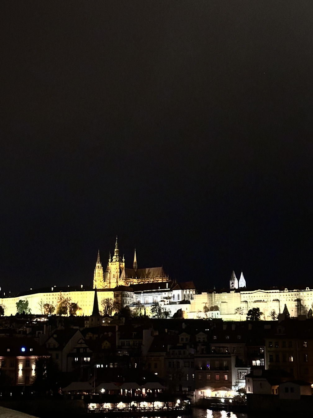 굴뚝빵 하나를 사서 먹으면서 야경을 보러 까를교로 향했다. 까를교 입구에서 본 야경부터가 말이 안 나올 정도로 아름다웠다. 건너편에서 보는 프라하 성의 모습은 정말 디즈니에 나올 것 같은 풍경이었다. 사진도 찍고 까를교를 건너가기 시작했다. 프라하 성에 다가갈수록 성, 그리고 성 비투스 성당이 점점 크게 보여서 더 아름다웠다. 프라하 야경이 유명해서 기대를 많이 했는데, 기대보다도 아름다웠다. 엄마랑 감탄을 하면서 거의 다리 끝까지 걸어갔다가 다시 돌아와 숙소로 향했다.