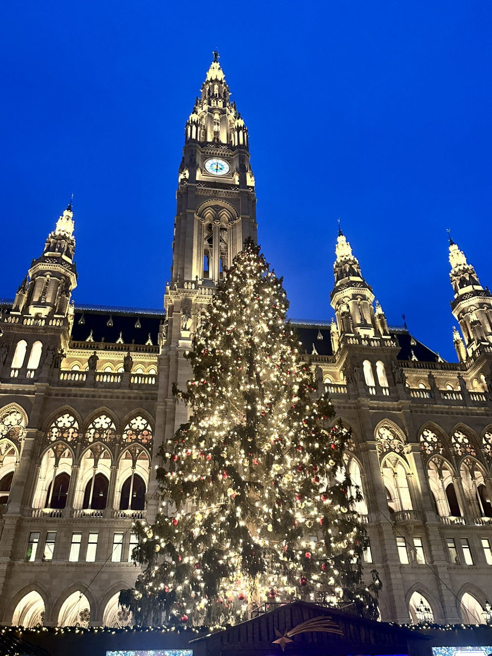 비엔나에서의 마지막 일정은 시청 크리스마스 마켓이다. 유럽의 3대 크리스마스 마켓 중 하나인 시청 크리스마스 마켓! 기대가 컸다. 트램을 타고 가서 시청 앞에 내리자마자 커다란 장식물이 보여서 기대감이 높아졌다. 들어가니 회전목마와 많은 가게들이 있었다. 트리 장식도 팔고 따뜻한 와인도 팔고 있었다. 크리스마스 장식이 다른 마켓보다 예뻐서 엄마 기념품도 구매하면서 가게 구경을 마쳤다. 여기는 특이하게 옆에 공원 같은 공간, 나무들 그리고 가로등도 크리스마스로 꾸며놔서 하나의 크리스마스 마을에 온 것 같은 기분이 들었다. 마켓의 규모가 거대하지는 않지만 장식이 예쁘고 시청의 야경도 아름답고 시청과 장식의 조화가 아름다워서 유명한 것 같다.