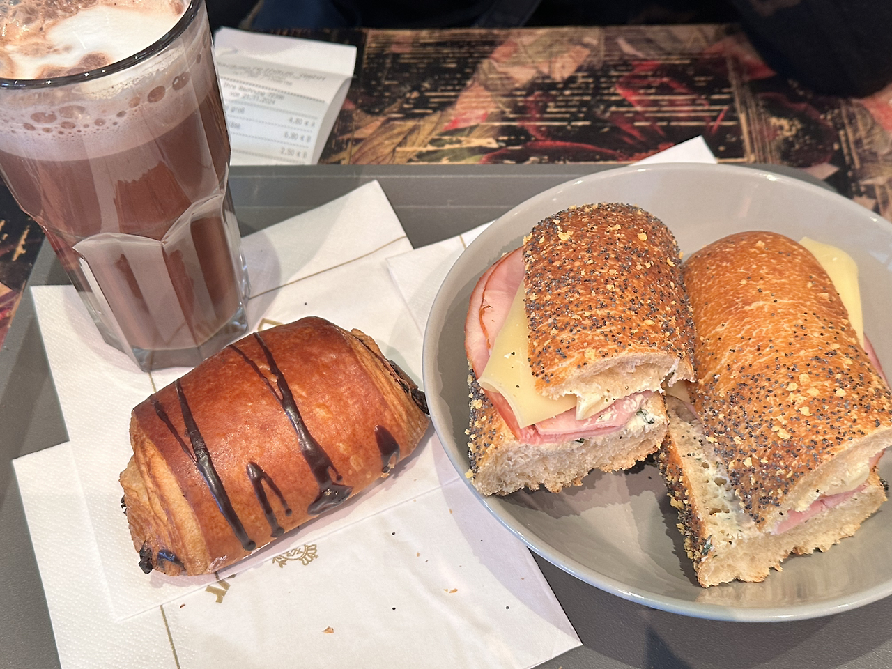 그렇게 성 구경도 마치고 나와서 근처에 빵집에 갔다. 샌드위치와 뺑오쇼콜라 그리고 코코아를 주문해서 먹었다. 잘츠부르크에서의 코코아를 마시고 엄마가 코코아의 매력에 빠져서 코코아를 주문해 봤다. 샌드위치와 뺑오쇼콜라는 역시 맛있었고, 코코아도 진해서 맛있었다.