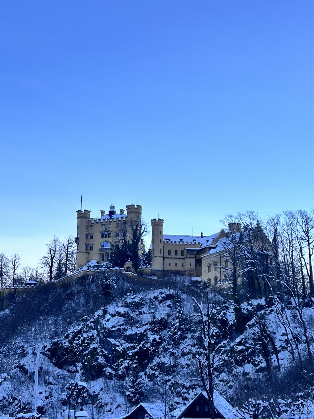 그렇게 걸어 성에 도착하니, 생각보다 규모가 컸다. 우리는 안에 들어가지는 않아서 바깥 경치 구경을 했는데, 역시 아름다웠다. 배산임수의 지형이라서 앞에 커다란 호수, 눈으로 덮인 작은 집들 그리고 설산까지 한 폭의 명화, 그리고 디즈니 오프닝을 보는 것 같았다. 나도 행복했지만 엄마가 좋아하는 모습을 보니 더 행복해졌다. 그렇게 한참을 구경하다가 추워져서 내려오기로 했다.