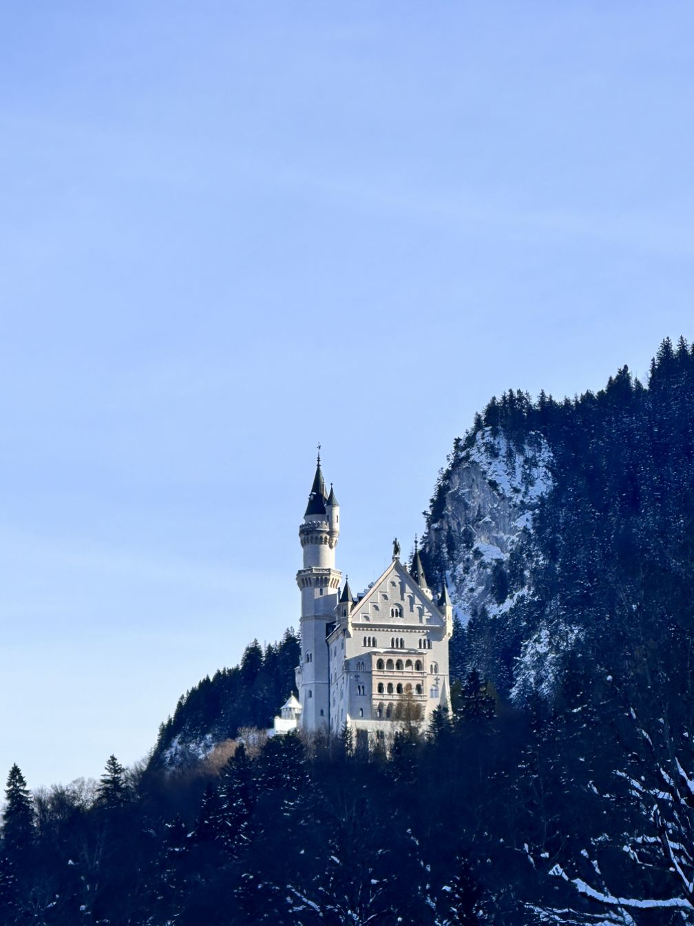 말을 타는 곳으로 갔는데, 셔틀버스 사람이 여기로 다 몰렸는지 줄이 길었다. 10분 정도 기다리다가 이 정도면 30분 넘게 기다려야 될 것 같아서 30분 정도 걸리는 거리를 걸어 올라가기로 했다. 눈이 와서 땅이 질퍽질퍽했지만 걸을만했다. 그렇게 중간중간 경치도 감상하고 사진도 찍으며 걸어 올라갔다. 디즈니 성이라는 별명답게 아기자기하면서도 아름답고 비현실적이었다. 하늘도 예뻐서 성이 두배로 예뻐 보였다.