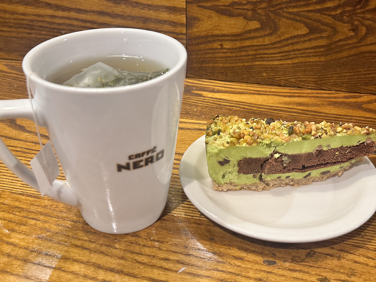 너무 재밌는 경기는 아니었지만, 첫 직관이라 그런지 마냥 좋았다. 다음에 또 가고 싶을 정도였고, 뮌헨으로 돌아가면 토트넘 경기도 중계로 챙겨보고 뮌헨 직관도 가고 싶어 졌다. 직관을 마치고는 30분 걸어서 역으로 가서 귀가했다. 바로 들어가기 아쉬워서 스콘에 차를 마시려고 했는데, 카페들이 일찍 문을 닫아 테스코로 향했다. meal deal로 내일 간식으로 먹을 샌드위치랑 과일, 물을 사서 민박집에 넣어놓고 다시 민박을 나섰다. 테스코 앞에 카페가 늦게까지 하고, 노트북으로 작업을 하는 사람들도 많아 오랜만에 카페에서 글도 쓰고 이것저것 찾아보려고 나왔다. 피스타치오 초콜릿 무스 케이크와 페퍼민트 차를 주문하고, 내일 볼 뮤지컬의 사운드트랙을 미리 들으며 글을 쓰고 있다. 이제 글을 마무리하면 민박집으로 돌아가 저녁도 먹고 씻고 다음 여행을 준비하며 하루를 마무리하려고 한다.