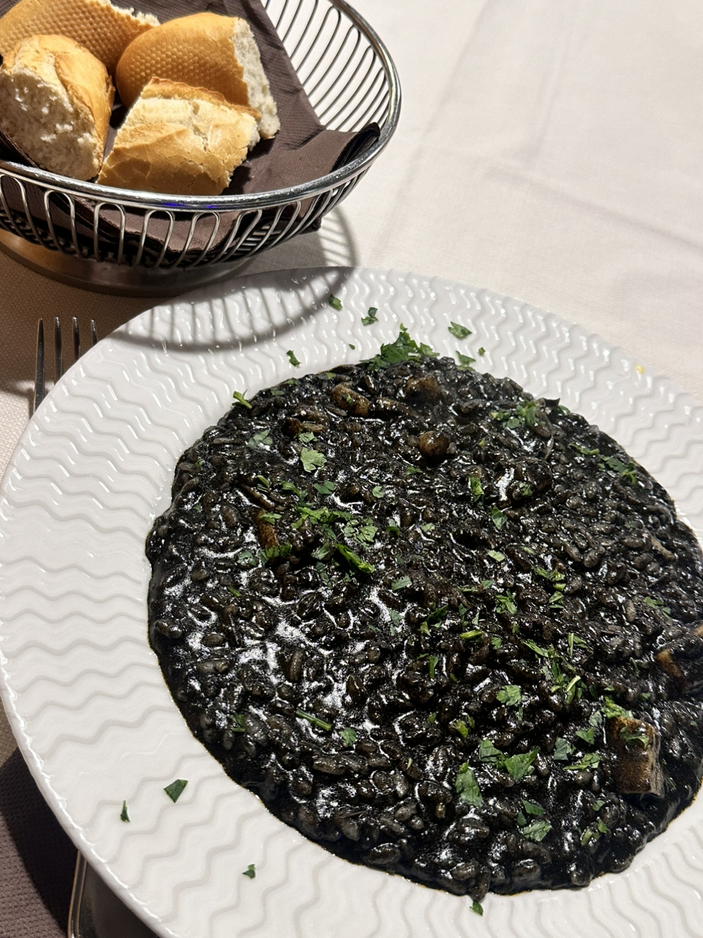 걷고 또 걷다가 점심시간이 되어 찾아놓은 리조또 집에 갔다. 리조또는 거의 2인분부터 주문이 가능해서 어제 찾아놓은 1인분이 가능한 리조또 집이었다. 먹물 리조또를 하나 주문했다. 사실 파스타를 사랑해서 리조또는 정말 1년 반 만에 먹는 건데, 해물이 들어간 리조또를 먹는 게 이번 베네치아의 버킷리스트라서 주문해 봤다. 주문하고 10분 정도 기다리니 까만 리조또가 나왔다. 살짝 짰지만, 밥도 적당히 잘 익고 간도 잘 베이고 부드러우면서 중독성 있어서 맛있게 먹었다. 오징어도 정말 부드러워서 오징어 한 조각에 리조또 조금 먹으니 잘 어울렸다.