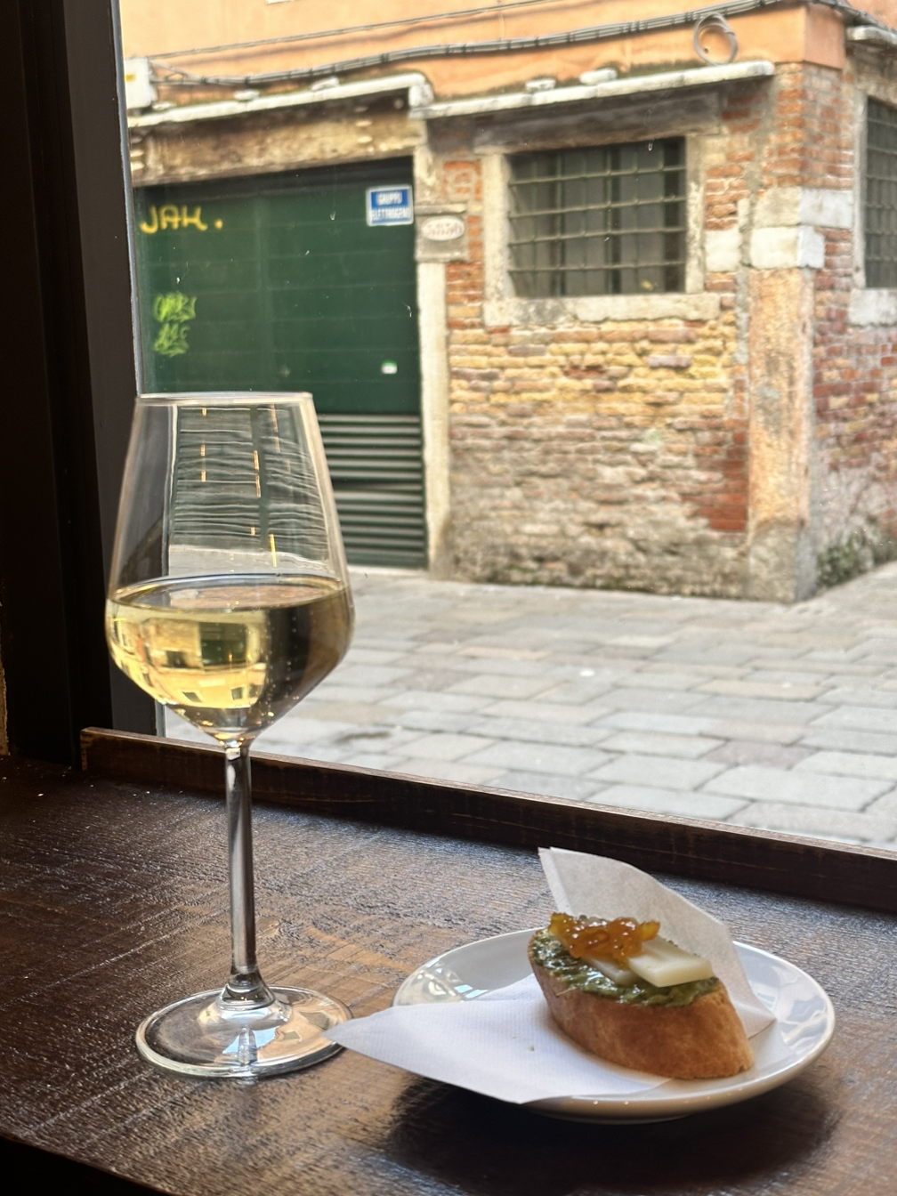 배부르게 먹고 다시 길을 나섰다. 한 시간 정도를 또 골목길을 구경하다가 우연히 치게티를 파는 바가 있어서 들어갔다. 사실 카페를 찾아서 가고 있었는데, 베네치아의 명물인 치게티 바가 있었고, 현지 사람들이 많아 보여서 홀린 듯이 들어갔다. 프로세코 한 잔과 치게티를 주문하고, 창가 자리에 앉아서 먹기 시작했다. 치게티는 바게트 위에 이런저런 재료를 올리는 베네치아의 요리이다. 훈제연어, 게살 등 다양한 맛이 있었지만 바질을 좋아하기도 하고 무난한 안주를 고르고 싶어서 바질 위에 치즈와 잼이 올라간 치게티를 골랐다. 일단 프로세코부터 마셔봤는데 맛있었다. 찾아보니 프로세코는 샴페인과 화이트 와인의 중간 탄산이라고 하는데, 나에게 딱 적당하게 느껴졌다. 앞으로 나의 최애 와인은 프로세코가 될 것 같다. 이렇게 또 하나의 취향을 정립하니 뿌듯했다. 치게티는 보이는 그대로의 맛이었다. 바게트 위에 바질이 듬뿍 올라가서 바질 풍미가 느껴지고 치즈의 짭짤하고 고소한 맛과 마멀레이드의 달콤함이 조화를 이루는 맛이었다. 잠깐 앉아서 여유도 즐기고 책도 조금 읽었다.
