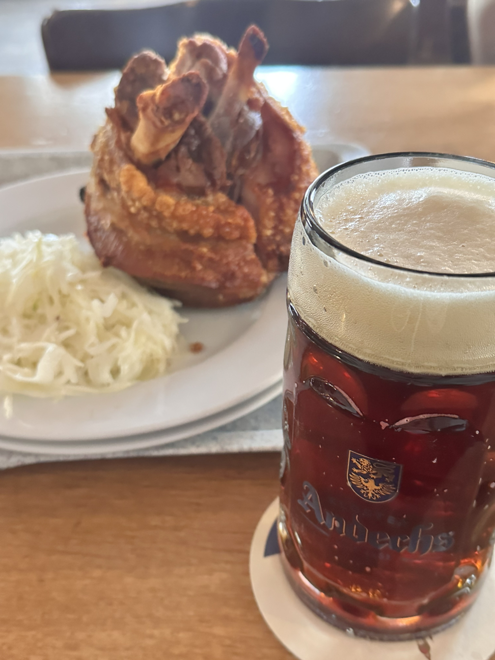 오늘의 새로운 목적지는 안덱스 수도원이다. 나의 인생 맥주를 파는 곳인데, 얼마 전부터 여기 맥주가 너무 마시고 싶어서 일찍 준비를 한 김에 가봤다. 전에는 계속 고기튀김 같은 것을 주문했지만 오늘은 학센이 먹어보고 싶어서 처음 주문했다. 맥주는 윈터비어로 주문했다. 겨울 시즌에만 나오는 맥주인데, 그냥 맥주와 여기 흑맥주가 반반 섞인 맛이다. 전에 엄마랑 왔을 때 밀맥주, 흑맥주 그리고 윈터비어를 주문했는데 윈터비어가 가장 맛있어서 또 주문해 봤다. 윈터비어 때문에 오는 내내 설렜는데, 여전히 맛있었다. 특유의 약간 달달하면서 풍미 가득한 향과 함께 청량하고 깔끔한 맥주 맛이 느껴져서 너무 맛있었다. 마지막이 될 수도 있다는 생각에 잠시 슬퍼졌지만 맛있게 마셨다. 학센은 너무 느끼해서 반도 못 먹었지만 안주로 조금씩 주워 먹었다.