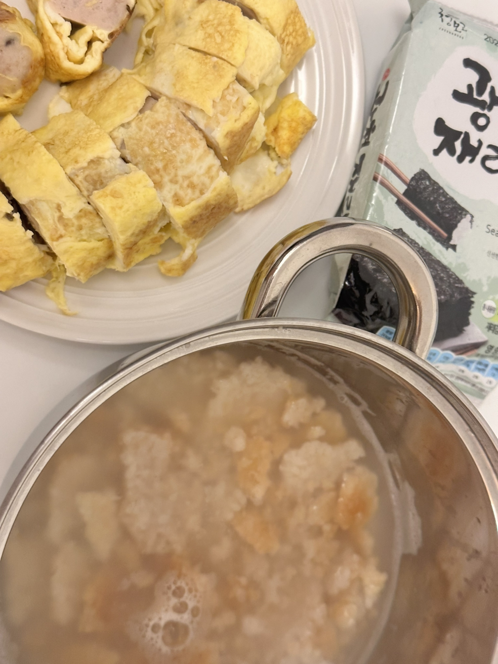 끝낸 줄 알았던 가족여행 계획에서 새로 알아보라는 게 있어 그것도 조금 알아보고, 오랜만에 홈트도 했다. 집이 좁아서 일어서서 하는 공간은 애매해서 누워서 할 수 있고 자리가 얼마 필요하지 않은 홈트만 깔짝깔짝 했다. 새로 시작한 책도 조금 읽고 뒹굴거리다가 저녁도 만들었다. 오늘 저녁은 오랜만에 소세지를 넣은 계란말이와 누룽지이다. 누룽지도 나의 페이보릿 음식 중 하나인데, 오랜만에 먹으니 더 맛있었다.