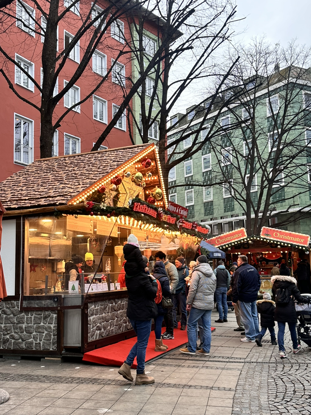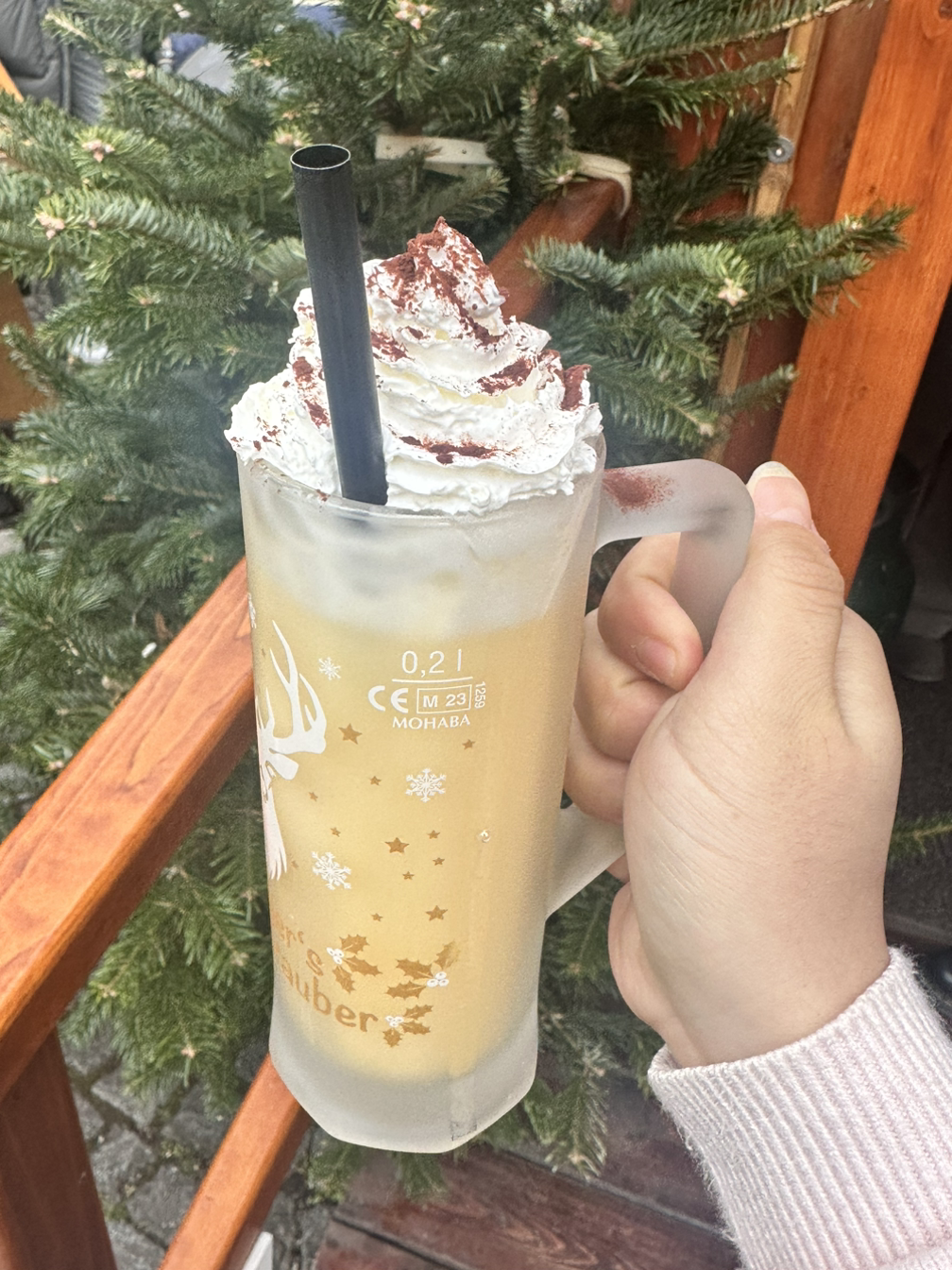 그렇게 배부른 점심을 먹고 향한 곳은 한 광장이다. 크리스마스에 진심인 유럽 답게 뮌헨에서는 메인 광장 이외에도 작은 광장들에도 크리스마스 마켓이 열리는데, 오늘 그중 한 군데를 방문했다. 여기는 중앙보다 조금 더 아기자기하고 동네잔치 느낌이 강했다. 오히려 메인 마켓보다도 정이 느껴져서 재밌었다. 크레페나 소세지, 빵과 같은 음식도 많았는데 배불러서 음료 한 잔만 주문했다. 아이어 푼쉬라는 이름의 음료인데, 달걀노른자와 화이트 와인, 설탕 등이 들어간 음료라고 한다. 위에 휘핑도 올려주셔서 비주얼은 카페 음료 같았다. 달달하게 맛있었지만, 살짝 느끼해서 다는 못 마셨다. 그래도 크리스마스 마켓 버킷리스트에 있던 음료 하나를 마셔봐서 기분도 좋고 뿌듯했다.