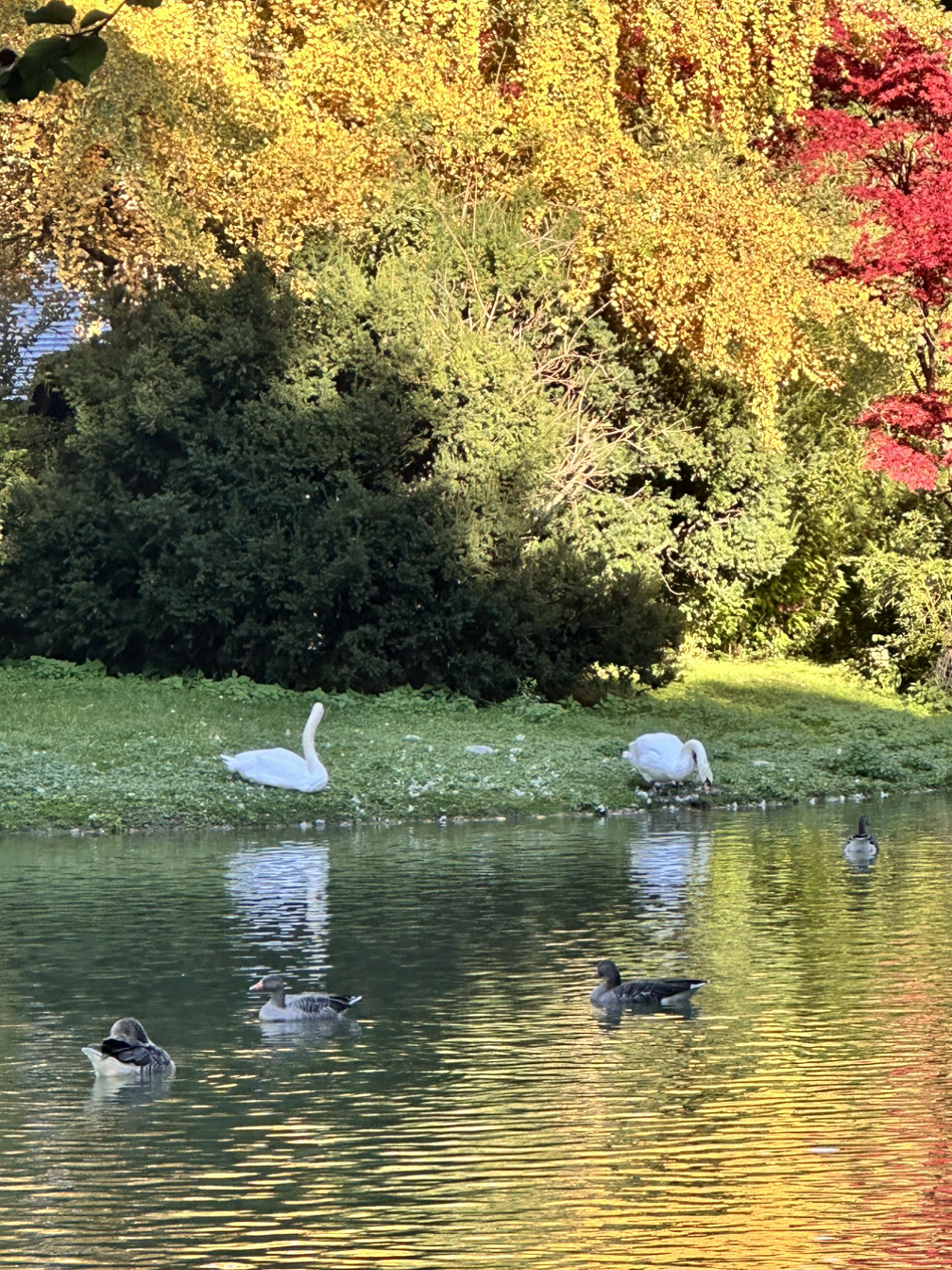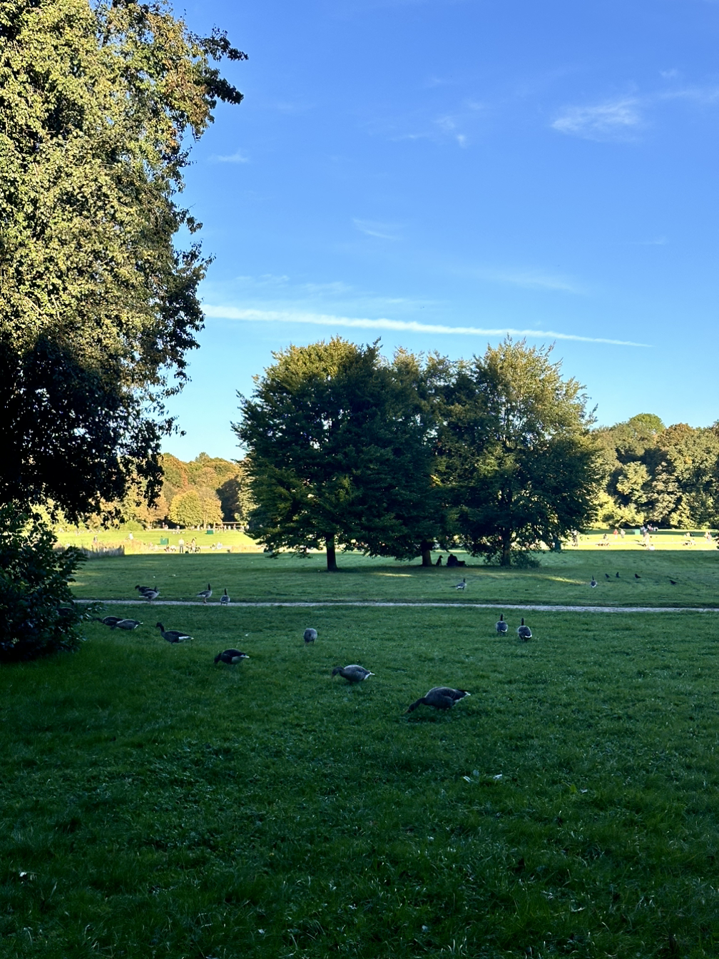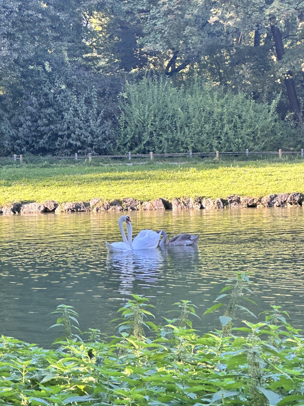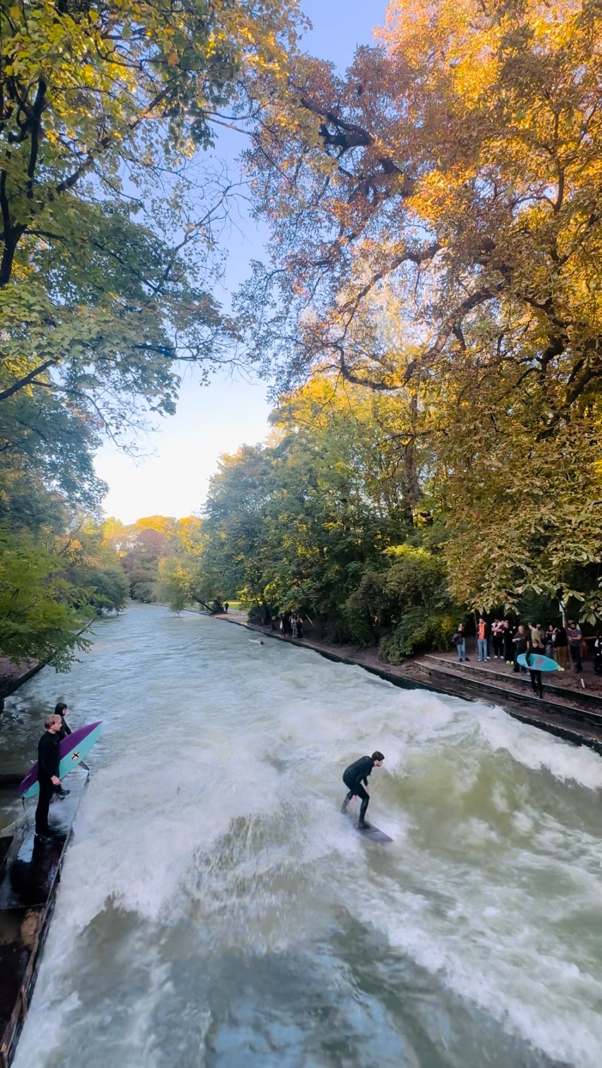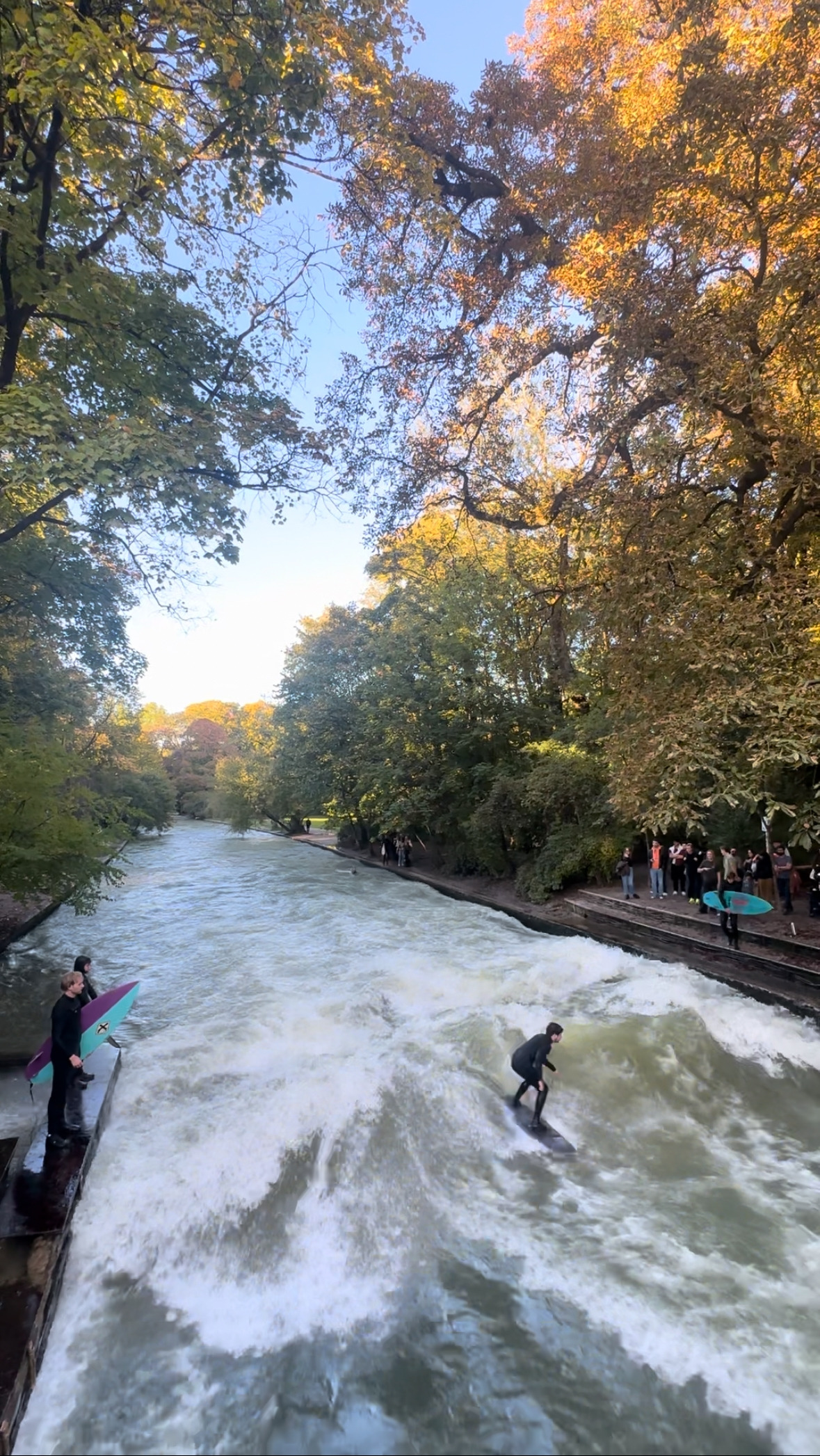 독일에 오면서 가장 기대한 장소인 영국정원에 갔다. 잠깐 독일어를 배웠을 때 잉글리쉬 가르텐(맞는 발음인지 헷갈린다...)이 예문에 많이 나오기도 했고, 언니도 많이 추천해 줘서 꼭 오고 싶었다. 카페에서 20분 거리였는데 소화도 시킬 겸 걸어갔다. 영국정원에 들어가자마자 보인 것은 작은 호수와 오리들이었다. 그리고 동물에 관한 지식이 없어 확실하지는 않지만 백조처럼 보이는.. 동물도 있었다. 따사로운 햇살에 낙엽이 아주 살짝 보이는 초록초록한 풍경, 그리고 귀여운 동물 친구들이 보이는 내 눈앞의 광경이 힐링이라서 떠날 수 없었다. 결국 옆에 벤치에 앉아서 20분 정도 멍을 때리다가 다음 코스로 향했다. 영국정원의 시작 부분?에서 사람들이 서핑을 하고, 서핑을 구경하는 곳이 있다길래 가봤다. 오늘이 내가 유럽에 있는 동안 볼 가장 좋은 날씨일 것 같아서 설레는 마음으로 걸어갔는데 눈앞에 예상보다도 더 예쁜 광경이 펼쳐졌다. 파도가 있는 곳에서 서퍼복을 입은 사람들은 서핑을 하고, 많은 사람들이 구경을 하고 있었다. 취미로 서핑을 하시는 분들이 서핑을 하고 계셨는데, 취미와 도전을 즐기는 사람들이 빛나 보였고, 그분들의 진지한 표정과 행복한 웃음 그리고 넘어져 물에 휩쓸려 가도 다시 나와서 다음 서핑에 도전하는 모습이 멋있고 응원하고 싶어서 한 40분을 행복하게 바라봤다.