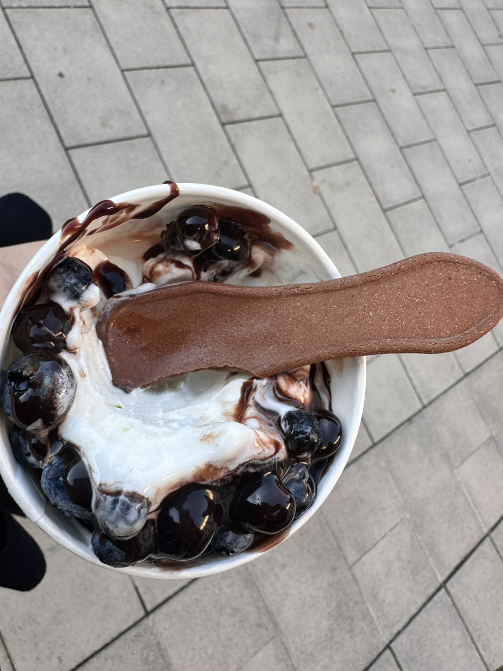 그러다가 시간이 늦어질 것 같아서 마지막 코스인 아시안마트로 향했다. 7시 이후에는 먹지 말자는 나만의 작은 규칙이 있었는데, 집에 가면 아무래도 7시가 넘을 것 같아서 고민을 하다가 요거트 아이스크림집이 보여서 홀릴 듯이 들어갔다. 한국에서도 요아정을 사랑하고, 싱가포르에 여행 갔을 때도 llaollao를 사랑했기 때문에 독일의 요거트 아이스크림도 먹고 싶었다. mini size에 토핑 2개 있는 게 5.5유로였지만,, 한국에서도 요아정은 비싸니까 한 번 주문해 봤다. 토핑은 초코시럽과 블루베리로 해봤는데 역시 요거트 아이스크림에 초코와 과일은 실패 없는 조합이었다. mini 컵도 양이 많아서 꽤나 배부르게 먹었고, 여기는 특이하게 스푼이 초코 과자로 되어있었다. 그래서 아이스크림을 다 먹고 반 정도는 아작아작 먹었다.
