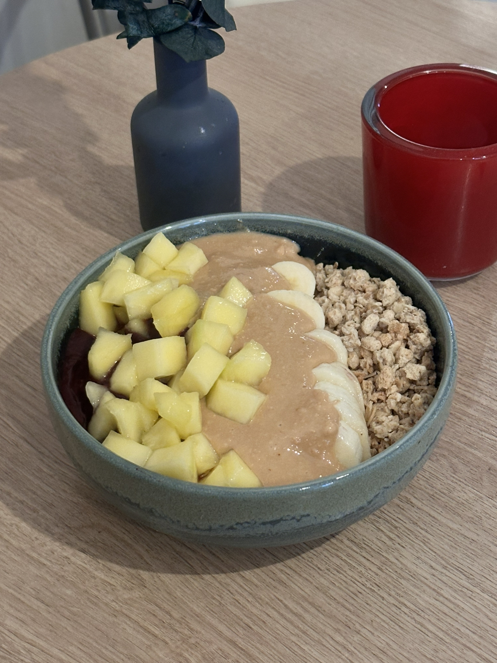 여유로운 하루의 시작이다. 자기 전에 식수 때문에 고민하고 찾아봤는데 결국 마트에서 사서 가지고 오기로 결정했다. 아침에 일어나서 마트를 왕복하면서 물을 18리터를 사 왔다. 어제가 일요일인데 물이 얼마 남지 않아 불안했기 때문에... 미리 왕창 일주일치를 사놨다. 그러고는 오늘 집주인이 잠깐 가구를 가지러 온다고 해서 기다려서 가구를 전해주고! 집을 나섰다. 첫 목적지는 어제 간 카페였다. 아사이볼이 유명한 카페인데, 어제 배불러서 커피만 마신 카페에 갔다. 커피가 따숩고 맛있기도 했고, 가게 분위기도 아기자기하고 한국에서도 아사이볼을 좋아해서 가서 점심을 먹기로 정했다. 지하철을 타고 10분 가서 15분 걸어가면 있는 카페인데, 할머니랑 전화하면서 걸어가니 15분이 금방 갔다. 가게에 도착해서 망고와 피넛버터를 추가한 아사이볼을 주문했다. 망고 추가가 1유로였는데 생망고가 나와서 1차 감동을 받고, 과일 추가가 1유로인데 피넛버터가 2유로라서 의아했는데 푸짐하게 나온 피넛버터에 2차 감동..! 먹어보니 적당히 시원하고, 오크베리보다 덜 달아서 좋았다. 뮤즐리도 바삭하게 맛있고, 상큼한 망고와 달달한 바나나, 고소한 피넛버터 그리고 베이스인 아사이베리가 조화로웠다. 진짜 아사이볼에 피넛버터 추가 필수!!!! ebook도 조금 읽고, 노래 들으면서 멍도 때리면서 시간을 보내다 졸려서 다음 카페로 이동했다. 한국에서도 카페를 좋아해서 카페투어를 자주 했는데 독일에서도 카페투어를 하니까 신기했다. 한국에서와 마찬가지로 책을 읽는데 항상 카페에 간 친구가 없어서 쓸쓸하기도 했다.