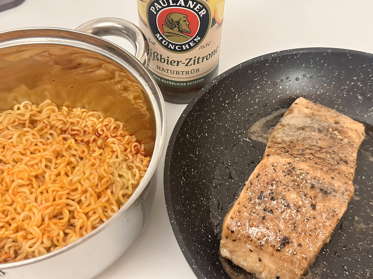 독서모임을 마치고 다시 나갈까 하다가 배도 슬 고파져서 저녁을 준비했다. 저녁은 연어구이에 신라면 볶음면이다. 독일에 거의 처음 왔을 때 아시안 마트에 구경 갔다 신라면 볶음면을 처음 보는 것 같아서 사봤는데, 오늘 드디어 먹기로 했다. 연어도 굽고 볶음면도 만들었다. 연어는 새로운 도전으로 뒤집지 않고 약불에서 꽤 오래 구워봤는데, 속이 회와 구이의 중간으로 익어서 맛있었다. 볶음면은 생각보다 매콤하지 않고 조금 달달해서 실망했지만 맛있게 잘 먹었다. 한국인의 소울 볶음면은 아무래도 불닭볶음면인 것 같다.