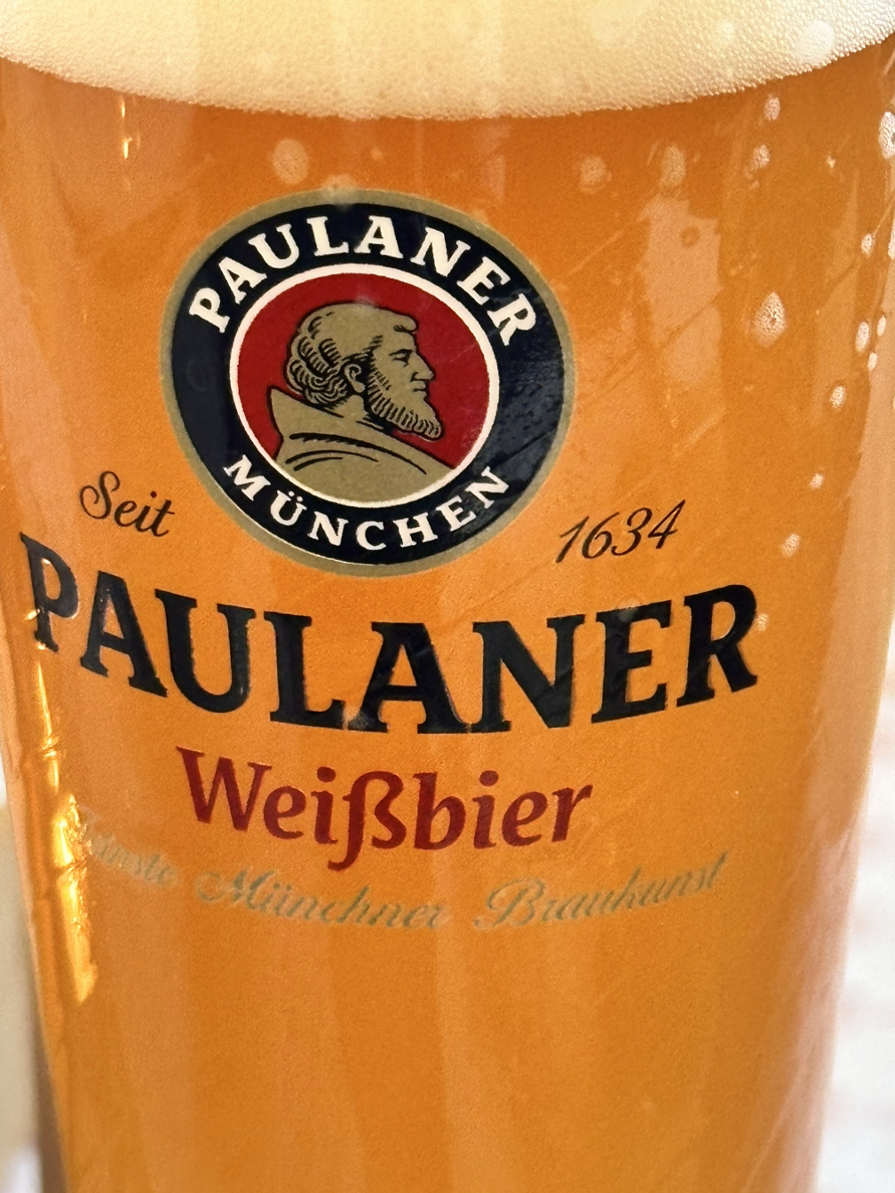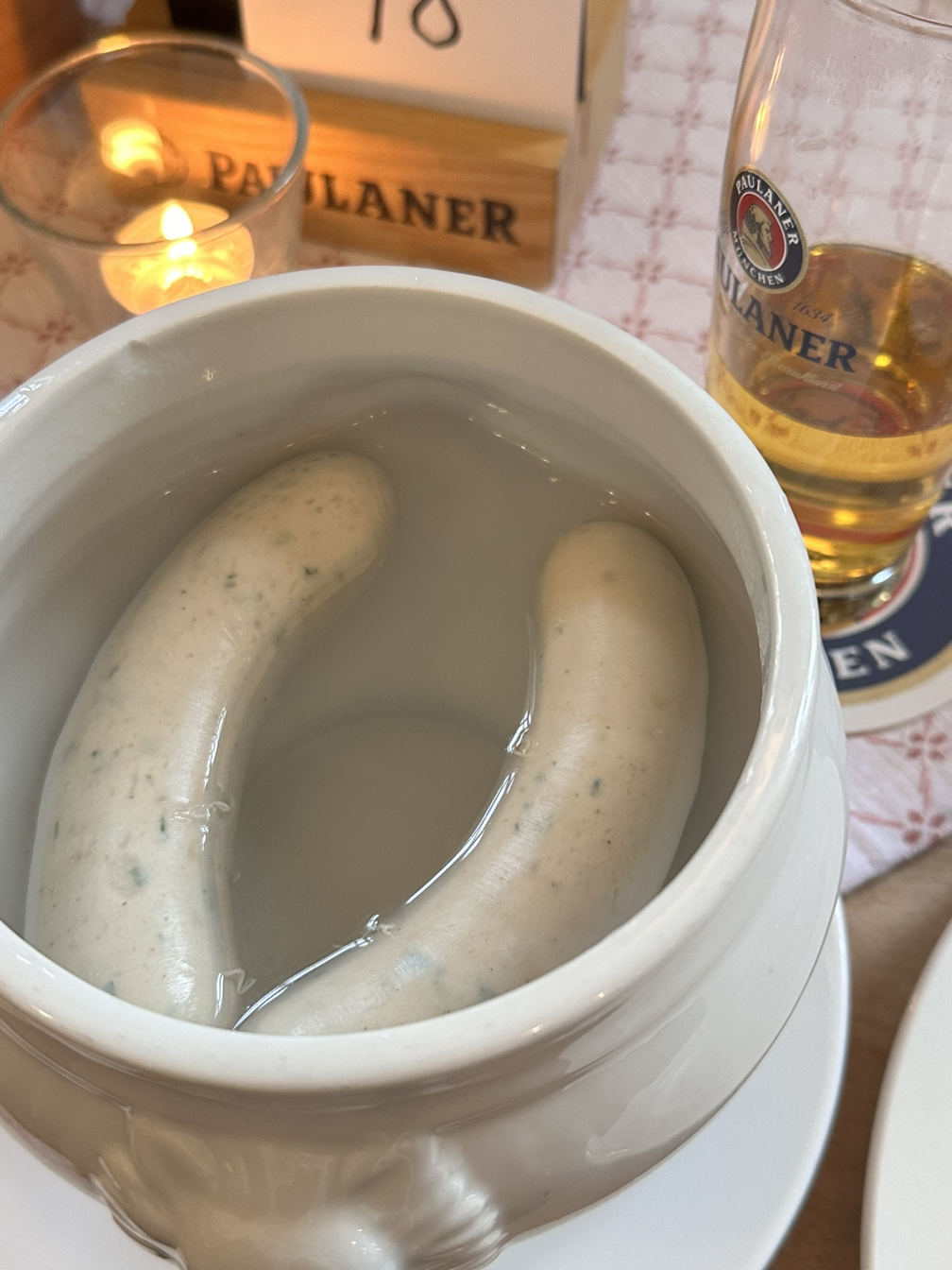 꽤나 외딴곳에 식당이 있어서 사람이 많을까 싶었는데, 들어가니 아침인데도 넓은 식당 내부가 바글바글했다. 그리고 관광객 같은 사람은 나뿐이라서 신기했다. 처음에 아무 자리 나 앉으면 된다고 하셔서 사람 없는 테이블에 앉았는데, 갑자기 서버분이 18번 테이블로 가라고 하셨다. 내가 있는 홀이 아닌 더 안쪽 홀에 있는 테이블이라서 엥? 싶었고, 사람이 앉아있어서 당황했는데 심지어 예약석이라는 표시가 있어서 잘못 온 줄 알았다. 하지만 내가 들은 숫자는 여기가 맞고, 직원 분께서 두 번이나 알려주셔서 분명히 여긴데 싶어서 생각해 보니 테이블에 혼자 오신 손님이 있어 혼자 온 나와 심심하지 않게? 붙여주신 것 같다. 친절하신 직원분 덕분에 맥주와 소세지를 주문하고 대화를 하게 되었다. 그분은 독일 분이신데, 고향은 독일 북쪽인데 뮌헨에서 일하고 계신다고 하셨다. 그러면서 서울에도 두 번이나 오셨다고 하셔서 서울과 유럽에 관한 얘기, 여행에 대한 얘기, 크리스마스에 대한 얘기 등등을 했다. 얘기를 하면서 가장 신기했던 것은 15년쯤 전에 북한에 갔다고 하셨다. 그래서 나는 본 적도 없다고 어땠는지 여쭤봤다. 그분은 creepy와 weird라고 하셨다. 밤이 되면 불빛이 하나도 없이 깜깜한데 자기들이 탄 버스에서 불이 켜지니까 사람들이 불빛에 모이는 하루살이처럼 우르르 몰려왔다고 한다. 그리고 건물도 축축해서 이상한 경험이었다고, 남한과는 많이 달랐다고 하셨다. 이런저런 얘기를 하면서 음식을 먹었다. 나는 뮌헨식 소세지인 하얀 소세지를 주문했는데, 뮌헨에 와서 먹어 본 하얀 소세지 중에 제일 맛있었다. 육즙도 촉촉해서 빵이랑도 맥주랑도 잘 어울렸다. 프레첼도 적당히 바삭하고 촉촉하고 고소해서 맛있게 먹고, 맥주는 파울라너 맥주였는데 청량감이 좋아서 라거 250ml를 마시고 밀맥주도 300ml 주문해서 마셨다. 그렇게 배부르게 먹고 다시 길을 나섰다.