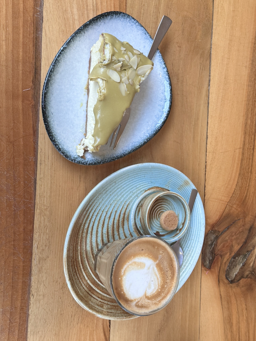 다음 목적지는 걸어서 40분 거리에 있는 카페였다. 후기가 좋아서 저장해 놨는데, 어제 집까지 걸어가다 지나쳤는데 예쁘고 분위기도 좋아 보여서 오늘 가보고 싶었다. 플랫화이트 한 잔이랑 피스타치오 치즈 케이크를 주문했다. 커피는 적당히 맛있었는데 피스타치오 치즈 케이크가 정말 맛있었다. 위에 올라간 피스타치오 크림이 피스타치오 초콜릿인지 달긴 했지만, 피스타치오의 고소함과 부드러운 치즈 케이크가 조화로웠다. 둘 다 크게 튀지 않는 맛이라서 더 맛있었던 것 같다. 책도 조금 읽고 멍도 때리다가 밖으로 나왔다.