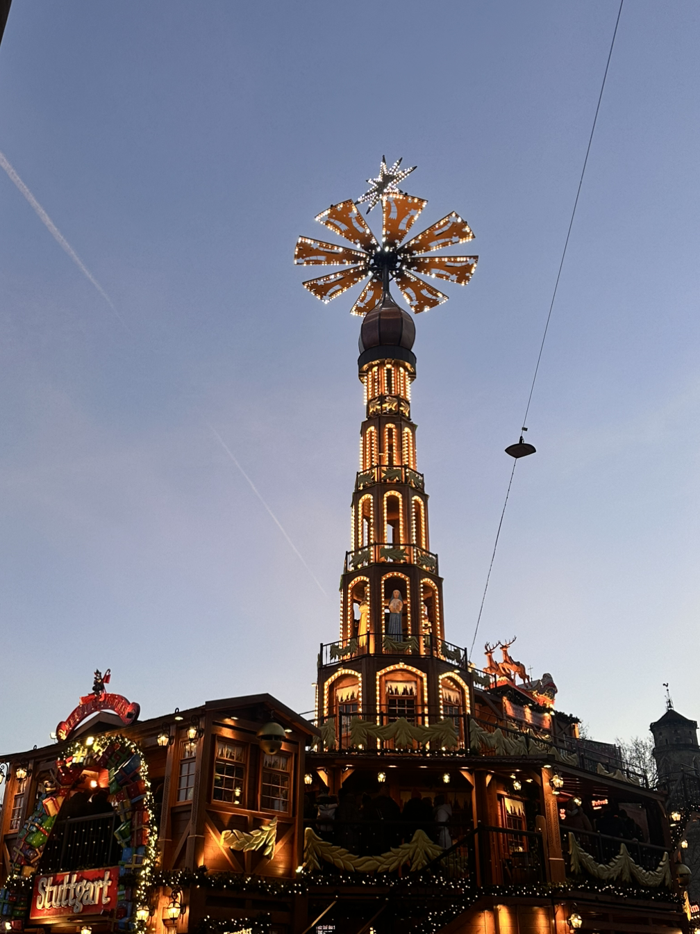 이제 슬 밖으로 나가고 싶어서 산책 겸 크리스마스 마켓 구경을 하러 갔다. 우리는 중간 지역으로 고른 곳인데 유명하고 규모가 큰 도시인지 거리에 사람도 많고 크리스마스 마켓의 규모도 컸다. 신기하게 도시 중심가를 쭉 이어 길고 큰 크리스마스 마켓이 있었다. 상점도 많고 먹거리도 많았다. 비슷한 음식도 많았는데, 신기하게 보통 소시지 길이의 두 배쯤 되는 기다란 소세지와 스테이크, 생선 구이가 있었다. 생선구이는 처음 봐서 신기했다. 그리고 음료 중에는 특이하게 로제 글루바인이 있어서 친구랑 한 잔을 사서 나눠 마셨다. 컵도 마켓별로 다른데, 우리는 반투명에 색깔로 그림이 그려진 예쁜 컵을 받았다. 로제 글루바인은 일반 글루바인보다 조금 가벼워서 마시기 더 좋았다. 확실히 해가 질 시간에 와서 살짝 어둑해질 때까지 보니 연말의 따수운 분위기가 물씬 느껴졌다.