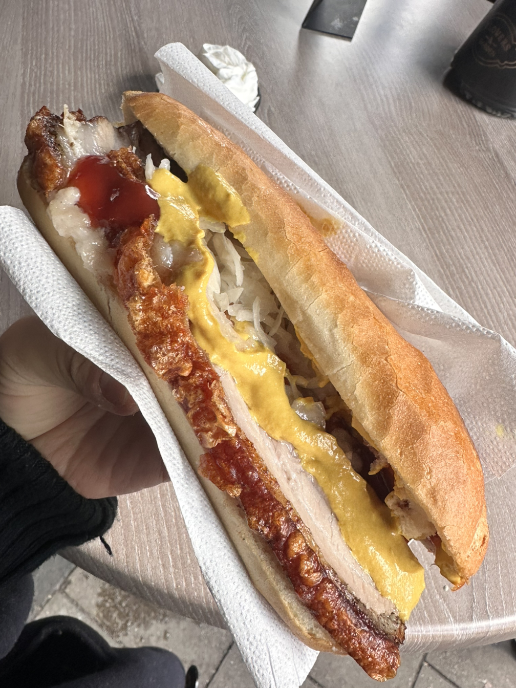 그렇게 컵까지 챙겨서 서점으로 갔다. 생일 카드를 사러 가서 독일 감성 낭낭한 편지지를 하나 샀다. 그러고 사람들이 하리보 쇼핑백을 하나씩 가지고 있길래 나도 구경을 갔다. 하리보의 나라라서 기대를 많이 했는데, 생각보다 작은 규모라서 그냥 나왔다. 그러고 점심을 먹으러 사람이 많았던 정육점 같은 곳으로 갔다. 사람도 많고 창문으로 본 소세지가 맛있어 보여서 핫도그를 주문했는데, 소통 오류로 돼지고기가 들어간 샌드위치를 받았다. 고기와 코울슬로 그리고 소스들이 들어가 있었는데 소세지보다 특별하고 덜 짜서 맛있었다.