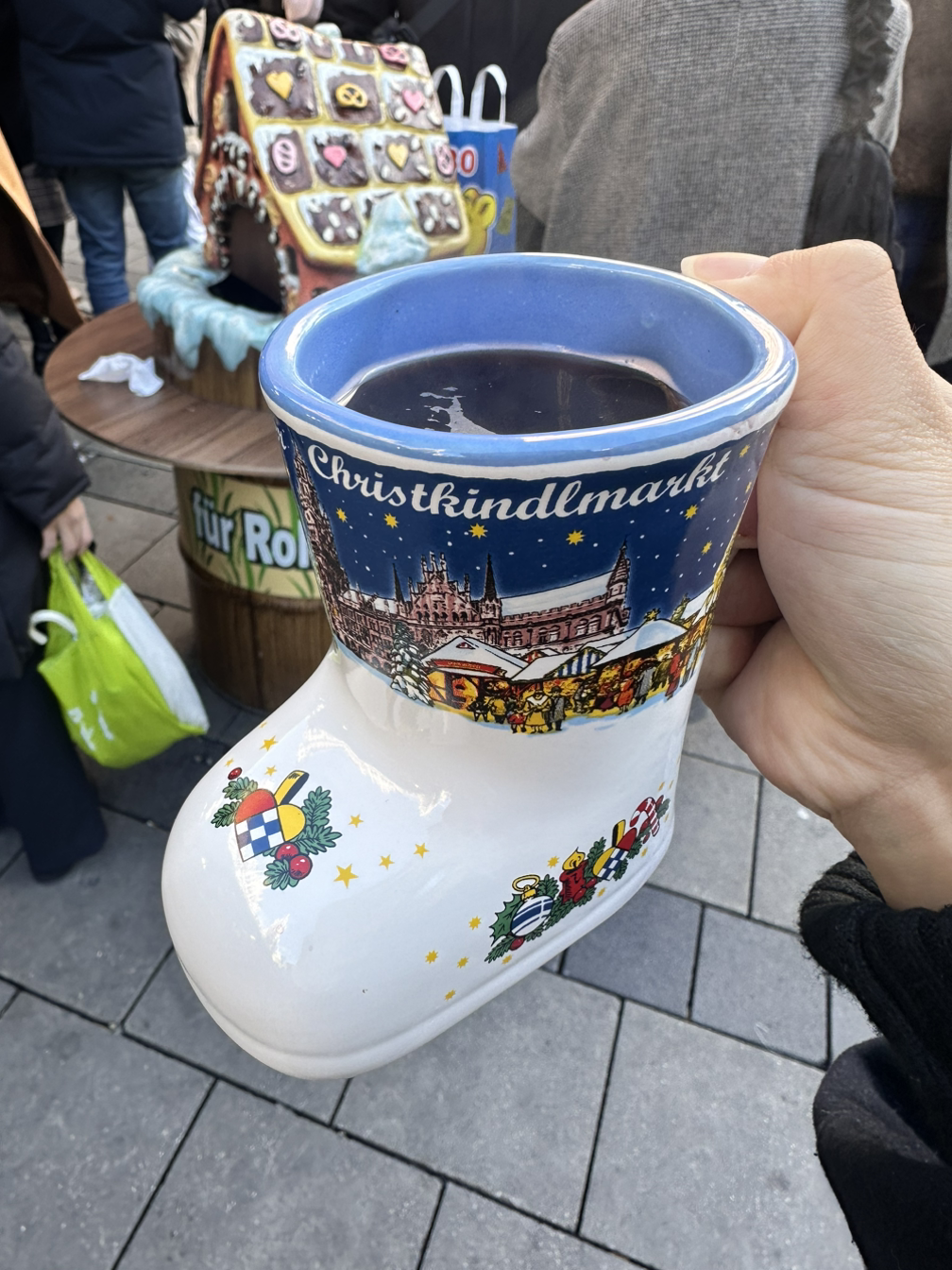 오늘의 첫 코스는 마리엔 광장! 근처 서점에서 편지지를 사러 갔는데 가는 길에 크리스마스 마켓부터 들렀다. 서점에 먼저 갈까 하다가 친구들과의 여행 전에 할머니랑 엄마랑 전화하느라 본의 아니게 산책을 조금 했다. 친구가 추천해 준 오렌지 푼쉬가 있길래 하나 사 마셨다. 여기도 컵이 투명해서 예뻤다. 가져갈까 싶었는데 전에 가져온 드레스덴 컵이랑 비슷해 패스했다. 그러다 보니 갑자기 크리스마스 컵을 기념으로 하나 가지고 싶었다. 아직 뮌헨 기념품을 제대로 사지 않아 크리스마스 마켓 컵을 하나 사면 좋을 것 같아서 마켓을 2바퀴 돌면서 열심히 골라 예쁜 부츠 모양이면서 뮌헨의 대표적인 건축물이 그려져 있고 뮌헨이 적혀있는 컵으로 골랐다. 컵을 사면서 또 푼쉬를 마셨는데, 푼쉬는 글루바인보다는 약 맛이 덜해서 맛있게 마셨다.