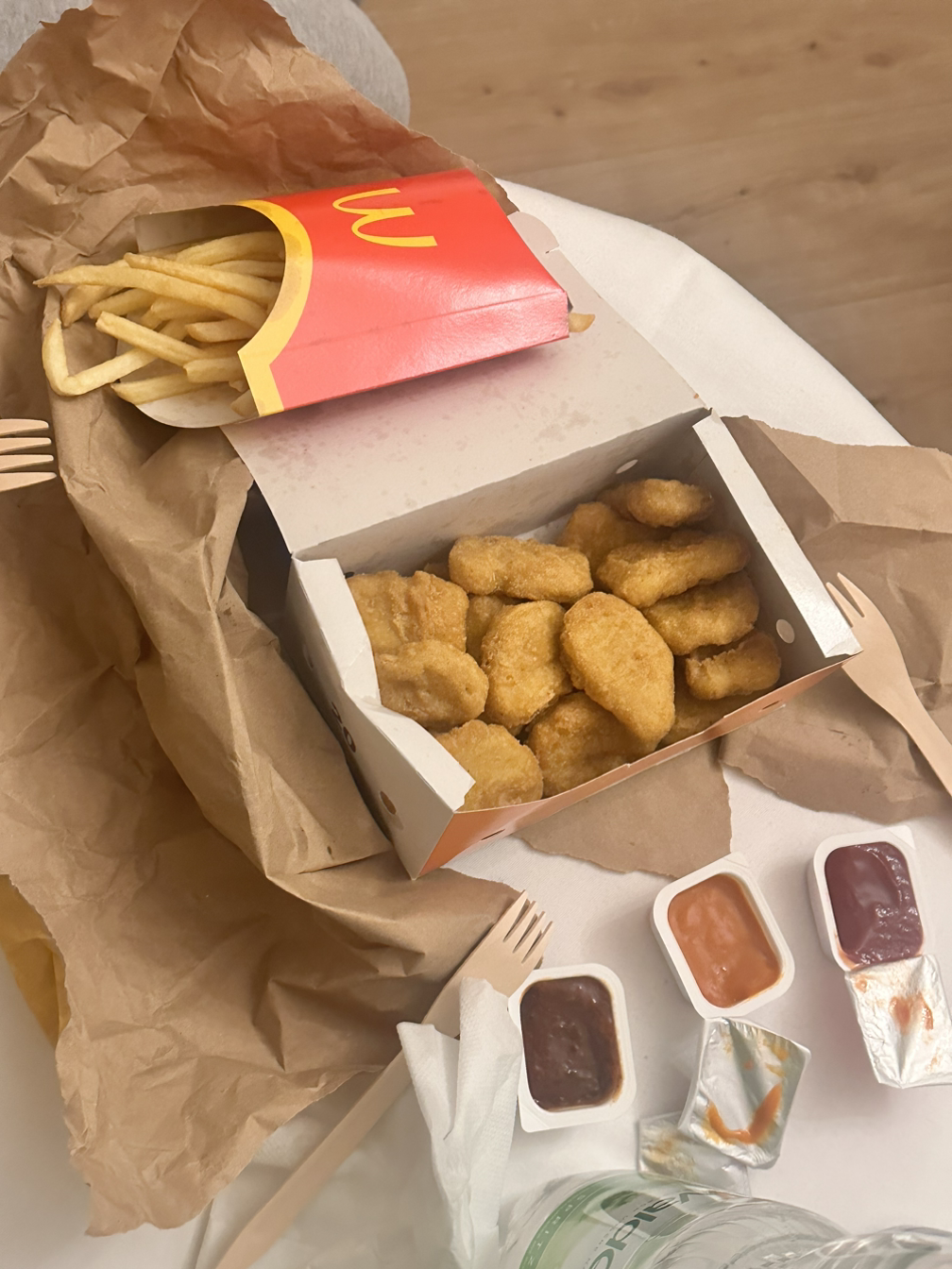 들어가서 한 친구가 씻는 동안 다른 친구랑 물과 야식을 사러 갔다. 마트가 닫아 길거리 가판대에서 물을, 맥도날드에서 감자튀김과 치킨 너겟을 샀다. 정말 추웠지만 친구랑 떠들면서 가니 반갑기도 재밌기도 했다. 마트 다녀와서 야식 먹으며 얘기도 하고 샤워하고 또 얘기를 하다가 잠에 들었다.
