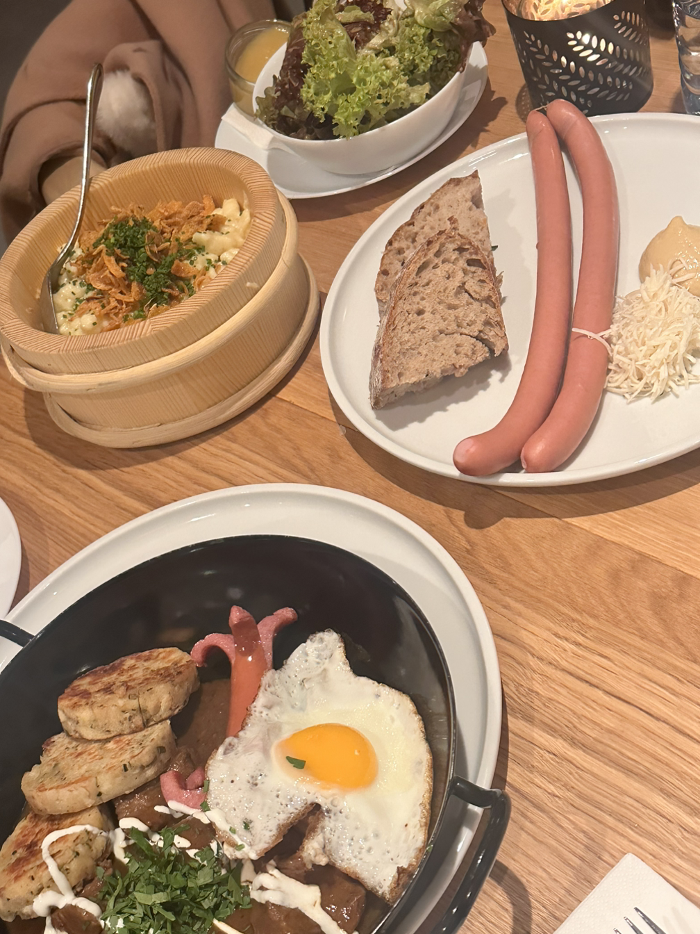 저녁 시간이 되어 저녁을 먹으러 갔다. 오스트리아 음식점에 가서 치즈와 밀가루가 들어간 오스트리아식 음식, 굴라쉬 그리고 소세지를 주문했다. 치즈와 밀가루가 들어간 음식은 홈메이드 맥앤치즈 같은 느낌이었다. 샐러드와 사과소스가 같이 나왔는데, 이 사과 퓌레 같은 것이 왜 나왔는지에 대해 진지하게 얘기를 하다가 결국 종업원 분께 여쭤봤더니 치즈밀가루 음식과 같이 먹는 거라고 알려주셔서 다들 놀랐다. 친구들과 얘기를 하면서 먹다 보니 한 시간 반이 훌쩍 갔고, 얘기도 흥미진진하게 많이 했다.