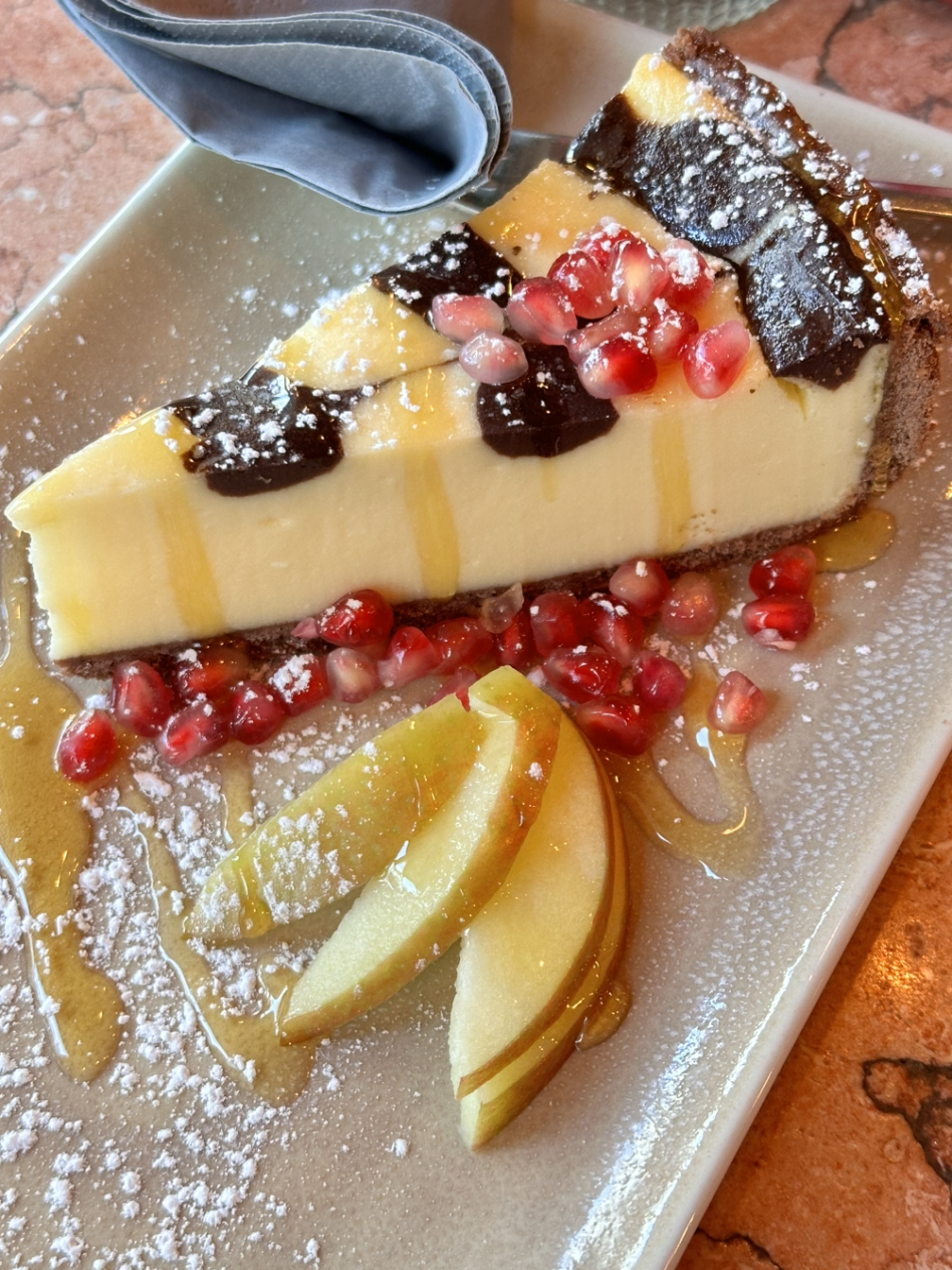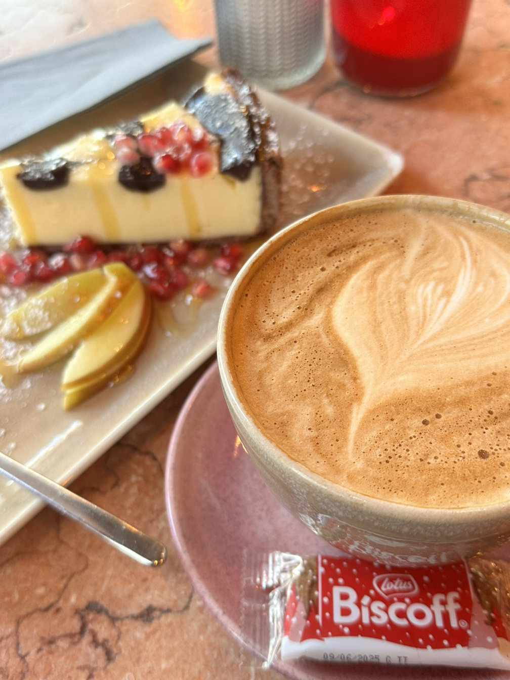 밥을 먹고 정리도 하고 조금 뒹굴거렸다. 어제오늘 꽤나 많이 뒹굴거린 것 같은데, 행복한 시간을 보낸 것 같다. 그러다 준비를 하고 집을 나섰다. 원래 계획한 오늘의 첫 코스는 최애 카페였다. 어제 친구들이 갔다는 얘기를 듣고 나도 당근케이크가 먹고 싶어서 가려고 했지만, 가는 길에 갑자기 가고 싶은 카페가 생겨 목적지를 바꿨다. 새로 정한 카페는 가본 적이 없는 뉴 카페였는데, 리뷰도 좋고 케이크도 맛있다고 해서 가게 되었다. 요즘 식당과 카페에 사람이 많아 이 카페에도 사람이 역시 많았지만, 테이블이 다행히 2개 비어 자리에 앉을 수 있었다. 나는 카푸치노와 초콜릿 치즈케이크를 주문했다. 케이크가 나오기까지 시간이 조금 걸려서 의아했는데, 비주얼을 보니 바로 이해할 수 있었다. 케이크 위에 꿀이 뿌려져 있고, 사과와 석류로 플레이팅이 되어있었다. 케이크가 달지 않고 꿀의 향이 좋아서 케이크와 꿀이 조화롭게 잘 어울렸다. 카푸치노는 살짝 썼지만, 케이크와 잘 어울려 맛있게 먹었다.
