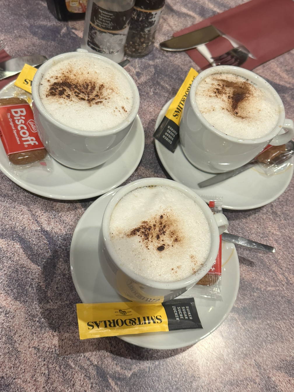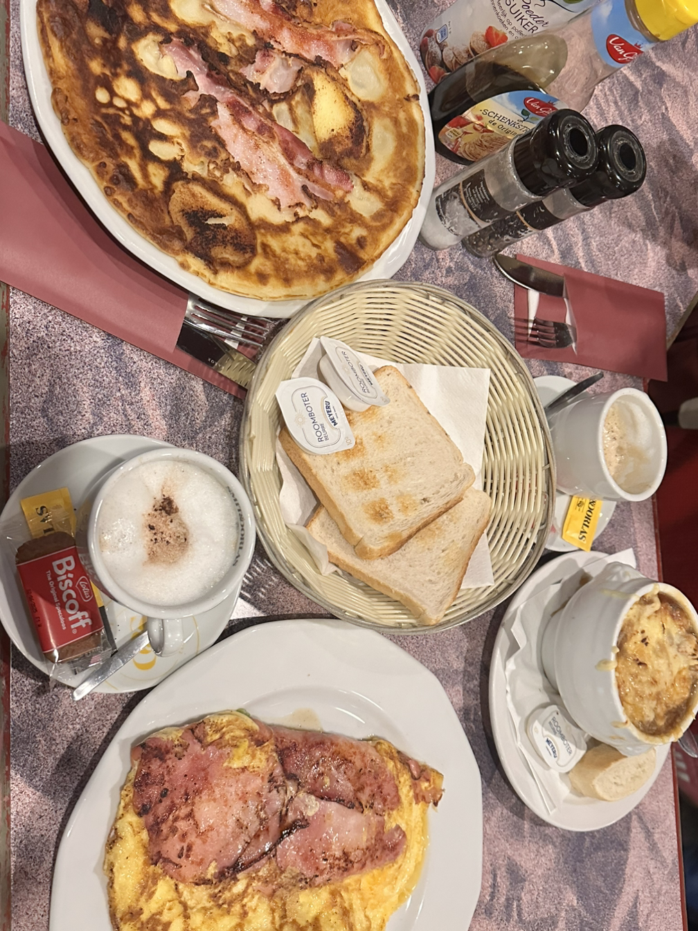 돌아가보니 친구가 준비를 마치고 기다리고 있어 다 같이 점심을 먹으러 갔다. 오믈렛과 팬케이크, 그리고 어니언 수프와 카푸치노를 주문했다. 여기는 우유가 맛있는지 카푸치노의 거품이 진하고 부드러웠다. 간이 살짝 셌지만 다들 배고파서 맛있게 먹었다.