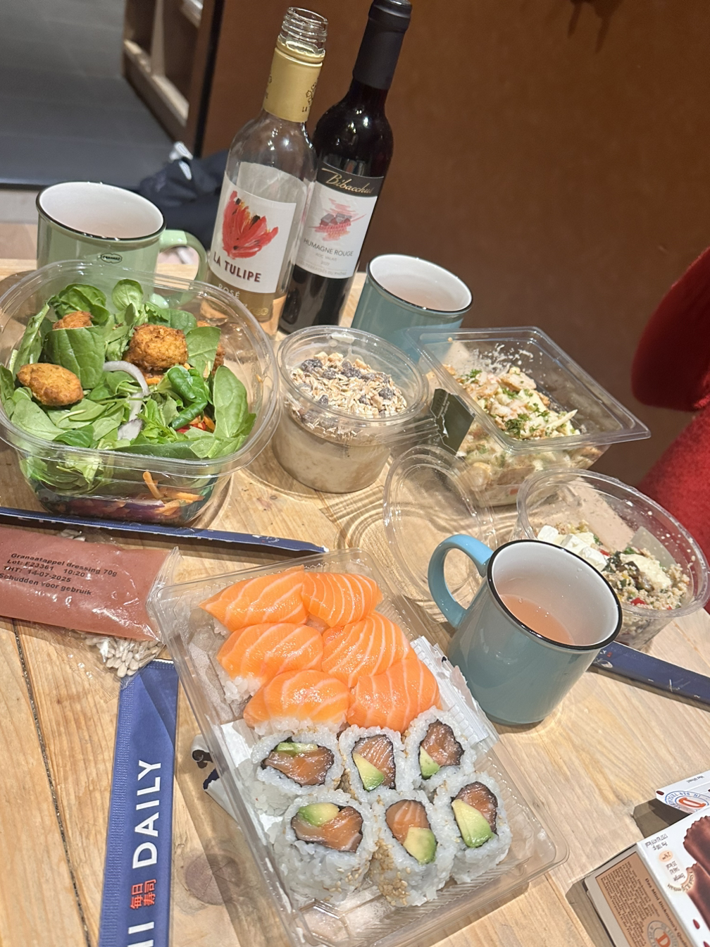 어찌저찌 구경을 마치고는 오전에 본 마트로 저녁을 사러 갔다. 마트 안에 스시 코너가 있는데, 무려 세 분이 밥을 짓는 과정부터 하고 계신 것을 보며 장인정신에 매료되어 저녁을 스시로 먹기로 했다. 나는 그래서 고민 없이 스시를 골랐는데, 친구들은 샐러드와 오트밀 콜드파스타 등을 골랐다. 그리고 카운트다운까지 꽤나 긴 시간이 남아서 와인도 하나 사고 곁들여 먹을 안주도 골랐다.