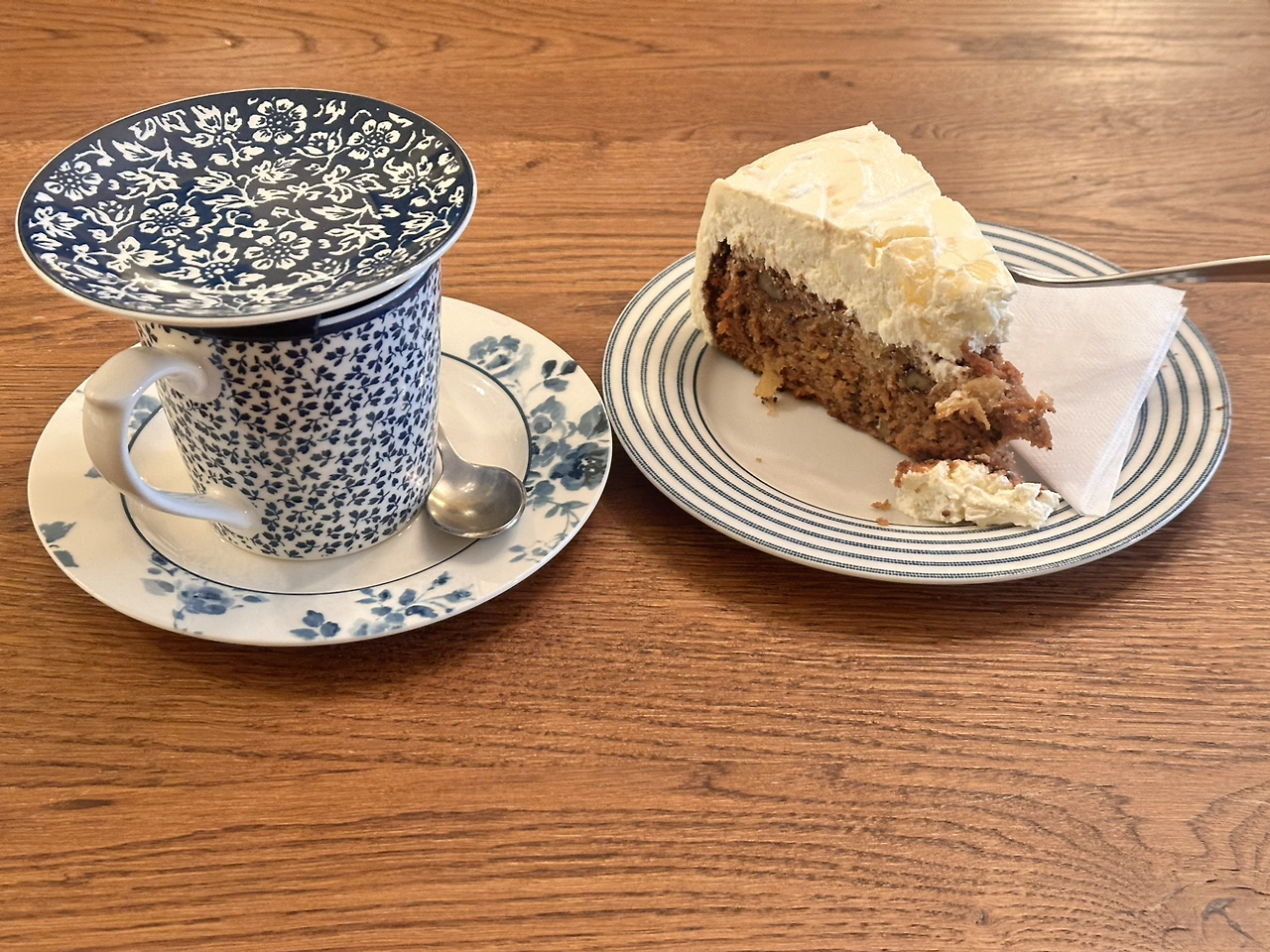 다음 코스는 최애 카페였다. 마지막 날이라서 가봤다. 오늘은 처음으로 전에 주문해 본 메뉴 중 가장 좋아했던 메뉴를 주문하기로 했다. 당근 파인애플 케이크와 월넛 차였다. 하지만 가자마자 한 번의 고민이 있었다. 오늘 처음 본 메뉴인 화이트 초콜릿 피스타치오 케이크가 맛있어 보여서 고민하다가 마지막 날이니만큼 당근 케이크로 정했다. 수많은 티 중에서 레몬 그레이, 자스민 그린티 등 마시고 싶은 차가 많았지만 같은 이유로 월넛 티를 주문했다. 전에 먹었던 맛 그대로 맛있고 행복했다.