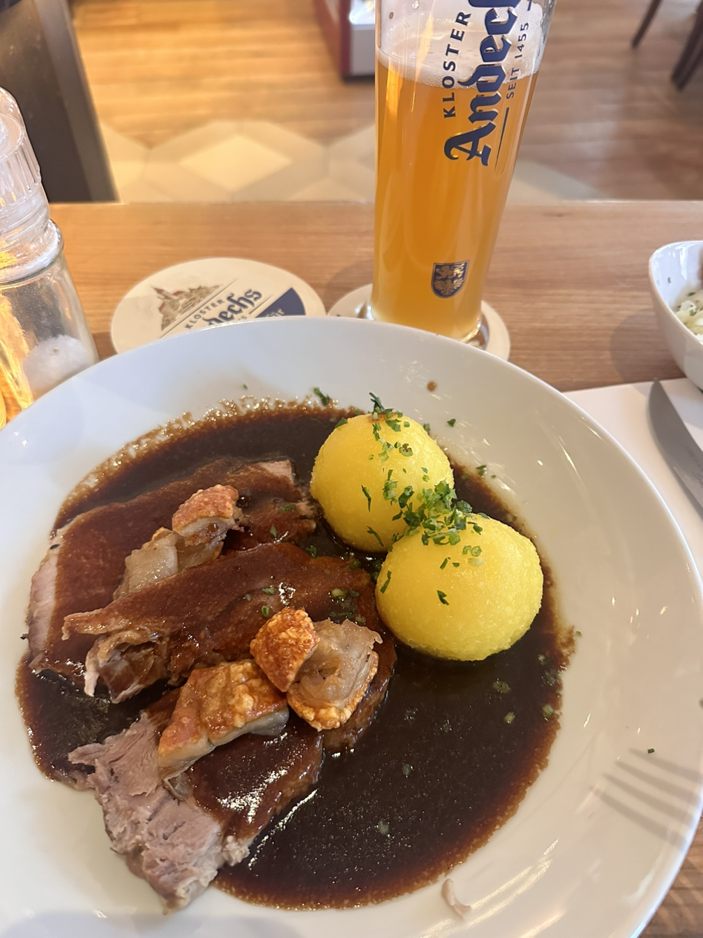 뒹굴거리다 마지막 날인게 아쉬워서 시내로 갔다. 맥주를 마시러 갔는데, 원래는 소세지 하나에 맥주로 가볍게 마실 계획이었지만 소세지는 아침에만 가능하다고 해서 어쩔 수 없이 조금 더 거창하게 고기로 주문했다. 정통 뮌헨식으로 다크비어 소스에 고기, 그리고 바삭한 튀김이 어우러져 벌써부터 그리운 맛이었다. 맥주는 여전히 맛있었는데, 뮌헨에서 가장 그리운 것은 아무래도 이 깔끔하고 청량한 맥주일 것 같다. 혼자 여운을 느끼며 점심을 즐겼다.