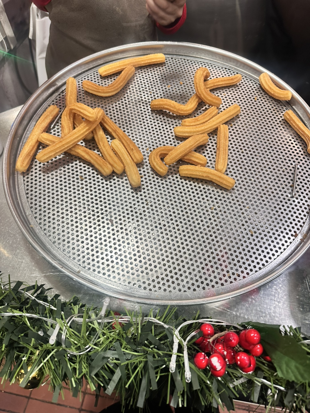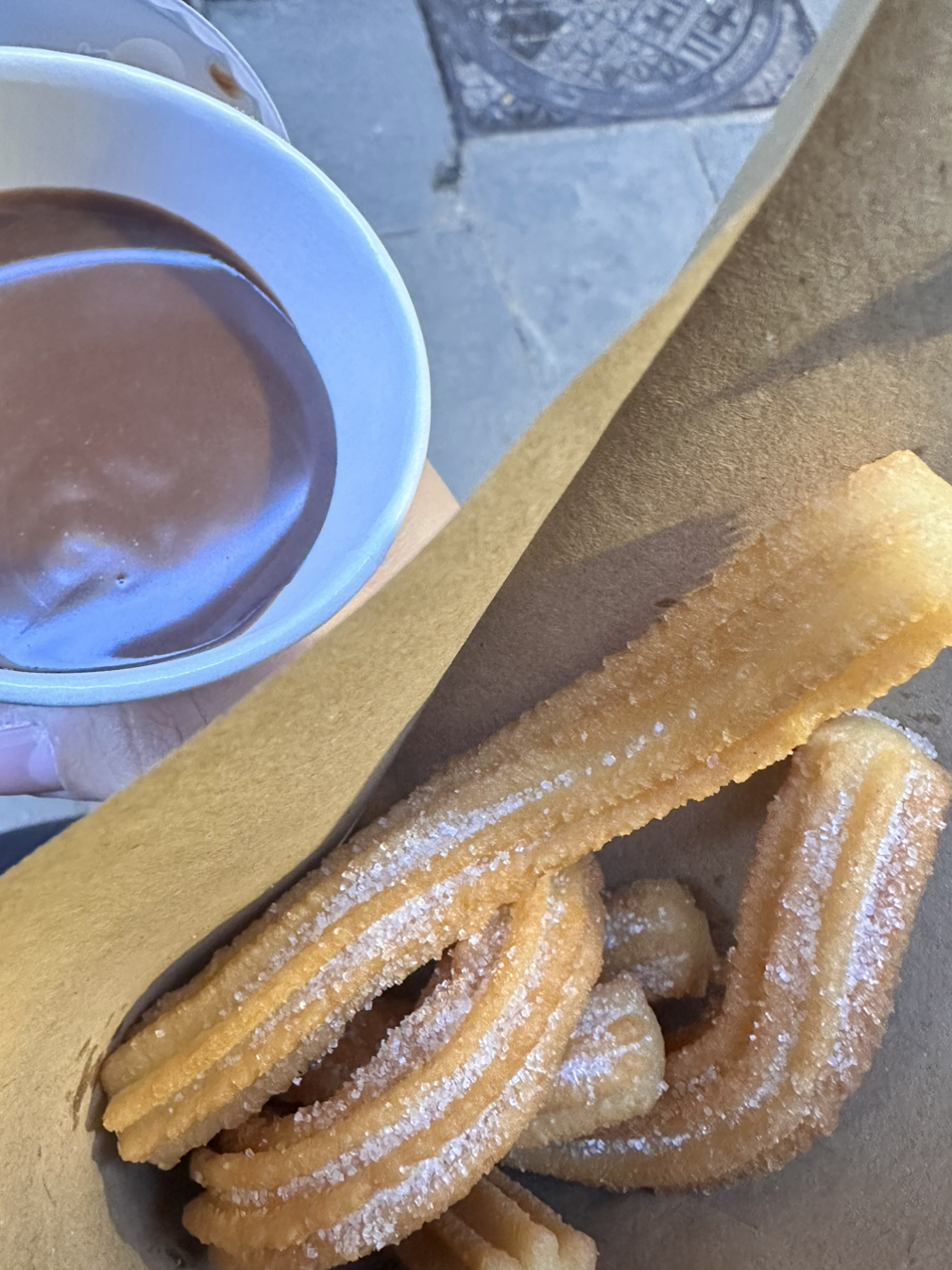 쉬다가 가족들이 오기까지 시간이 남아서 시내 구경을 나섰다. 그 유명한 스페인 음식을 먹고 싶었는데, 가족들이 오면 같이 먹고 처음의 감동을 느끼고 싶어서 가족들은 좋아하지 않는 츄러스만 먹으러 갔다. 가고 싶었던 츄러스 집은 신년 휴가라서 어쩔 수 없이 가장 유명한 집으로 갔다. 배도 고프고 당도 떨어졌는데 츄러스에 핫초코를 먹으니 기력이 충전되었다. 츄러스 자체는 한국과 큰 차이가 없었다. 갓 나온 따끈한 츄러스가 아니라서 조금 실망했다. 초코소스는 한국과 달라서 맛있었다. 한국은 누텔라 같이 보편적인 맛이라면 여기의 초코소스는 생각보다 그렇게 달지 않고 진하고 꾸덕했다.
