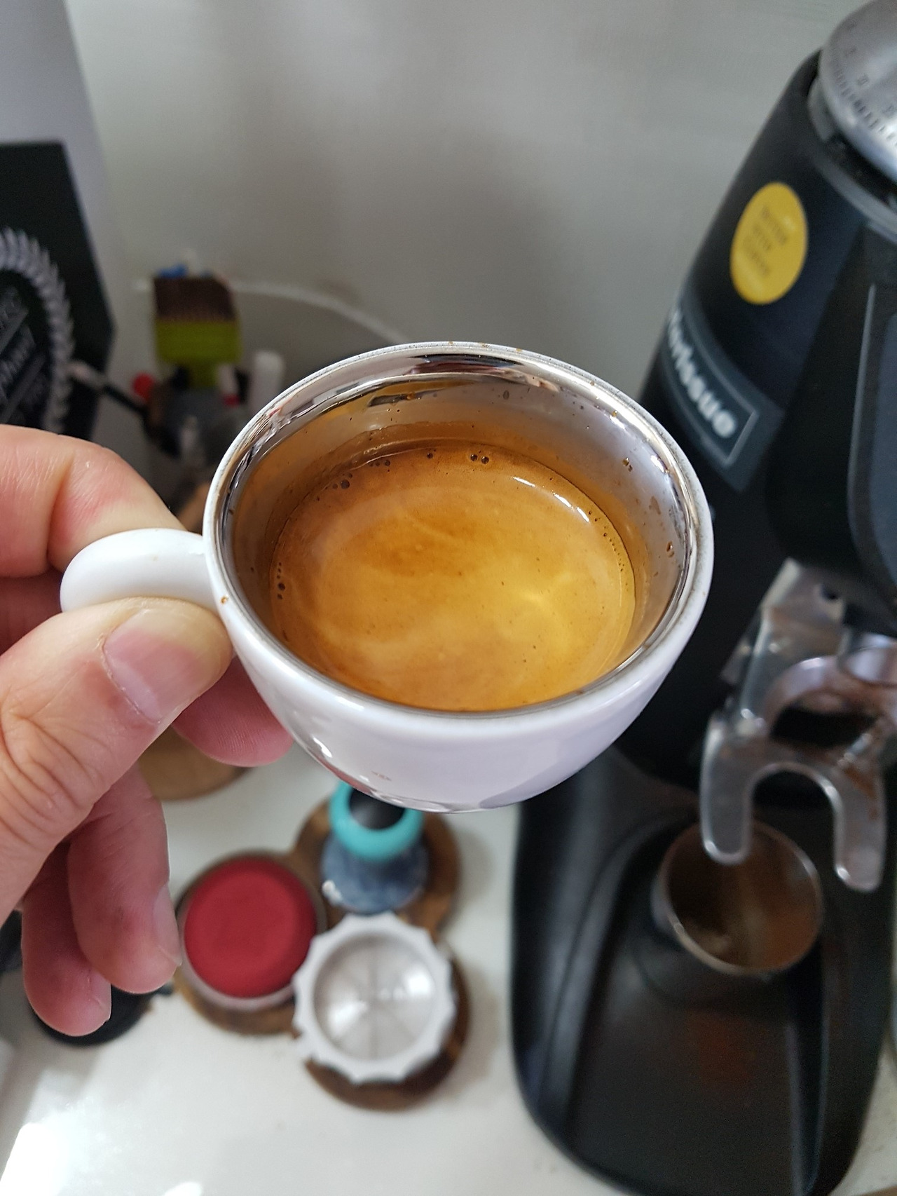 업체에서 추천하는 추출 노트는 원두 20g, 머신 보일러 온도 기준 94도, 프리 인퓨징 5초, 추출 시간 20~22초, 추출량 30~35g이다. 조금 의아 한 것이 추출 시간이다. 필자 역시 정해 놓지는 않았지만 보통 기본 추출 시 다른 조건은 비슷하지만, 추출 시간은 30초대로 추출을 한다. 하지만 업체에서 추천하는 20~22초는 과소 추출의 경향이 있을까 싶었다. 그래서 조금 길게 30초대 35~40g의 추출을 하였다. 밸런스가 꽤나 괜찮은 블랜딩 커피처럼 느껴졌다. 하지만 이내 후미의 잡미가 느껴졌다. 에스프레소와 아이스 아메리카노 역시 비슷한 뉘앙스였다. 그래서 다시금 업체에서 추천한 추출 노트대로 추출을 하였다.