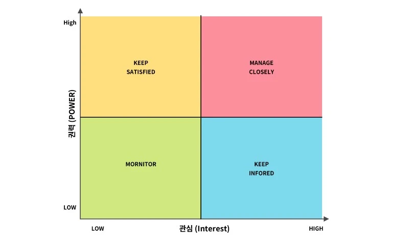 주어진 환경에 따라 방법을 변경하거나 추가할 수 있으며, 그중 가장 흔한 방법은 권력(Power)과 관심(Interest)에 따라 이해 관계자를 나누는 것이고 상황에 따라서는 권력(Power) 대신 영향력(Impact)으로, 관심(Interest)을 관여도(Involvement)로 변경할 수 있습니다.