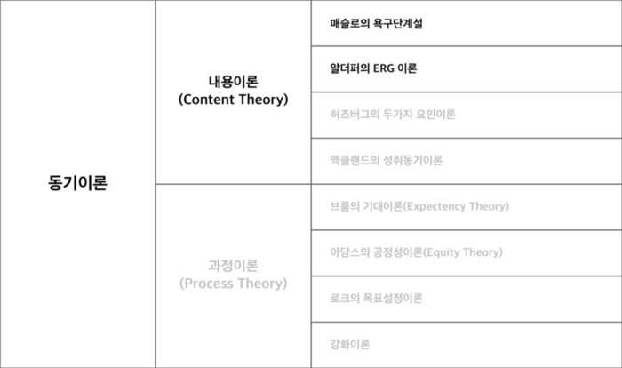 동기 이론은 크게 내용 이론(Content Theory)과 과정 이론(Process Theory)으로 나뉘며 그 안에서도 다양한 이론들이 있는데요.