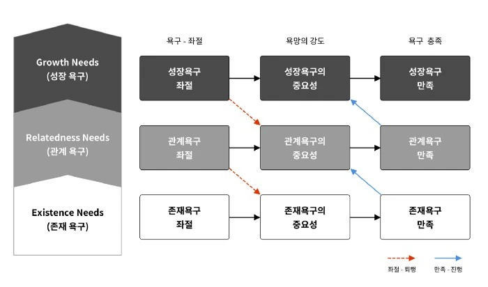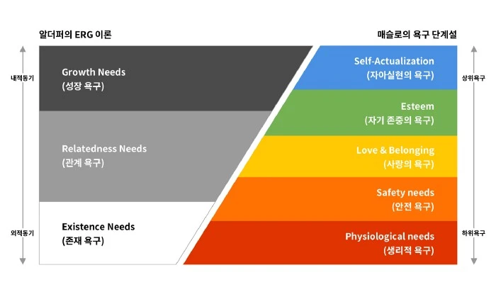 알더퍼는 저 차원의 욕구와 고차원 욕구 간의 기본적인 구별이 필요하다고 생각하여 매슬로의 욕구 5단계 구조를 생존 욕구(Existence needs), 관계 욕구(Relatedness needs), 성장 욕구(Growth needs) 총 3가지로 줄였습니다.