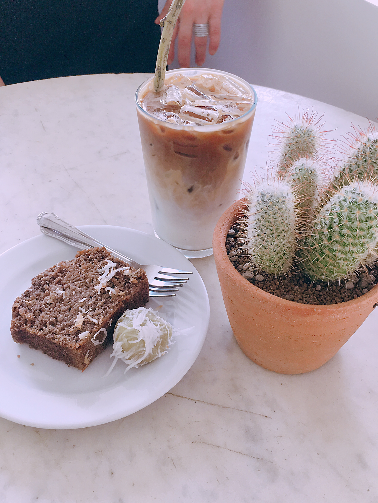 골목 사이에 위치했던 전체 통유리의 이 오가닉 카페는 생각보다 정말 내부가 작았다. 정원이라고 되어 있는 초록이들도 눈으로 보기에는 아름다웠지만, 너무 더웠던 날씨 탓에 밖에는 도저히 앉아있을 수 없었다. 한국말이 여기저기서 터져 나왔다. 자리를 잡고 정신을 차리고 둘러보니 방문한 손님 모두가 한국사람들이었다. 저마다 코코넛 커피와 코코넛 아이스크림, 망고 아이스크림 등을 주문한 것 같았고, 은색으로 된 자그마한 양은 도시락에 토마토 파스타, 대나무통밥, 치킨카레 같은 오가닉 푸드들을 곁들이고 있었다.